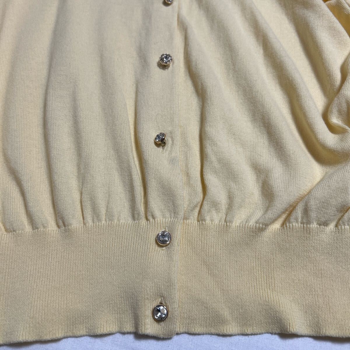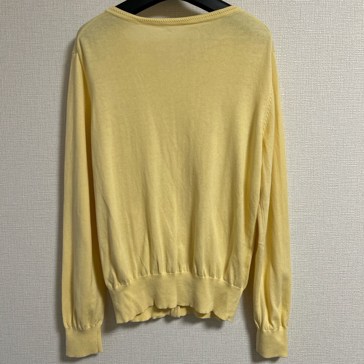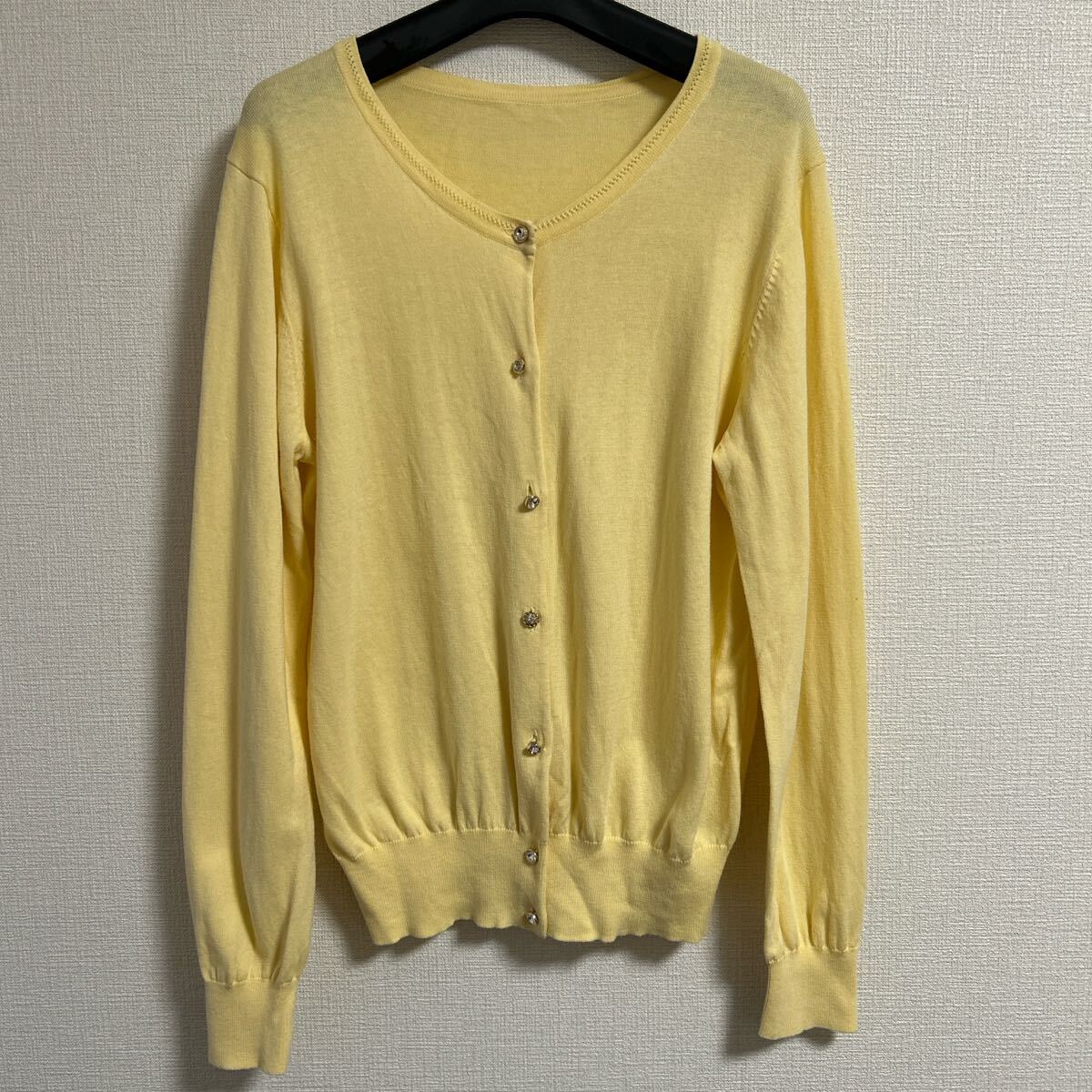 柔らかいニット素材のイエローボタン付きカーディガン、長袖デザインでリブ編み裾。 - 色: イエロー - デザイン: ボタン付きカーディガン - 素材: 柔らかいニット - 袖: 長袖 - 裾: リブ編み 着丈53、身幅48、肩幅37、袖丈57センチ。 目立ったダメージなどありません。 ご覧いただきありがとうございます。