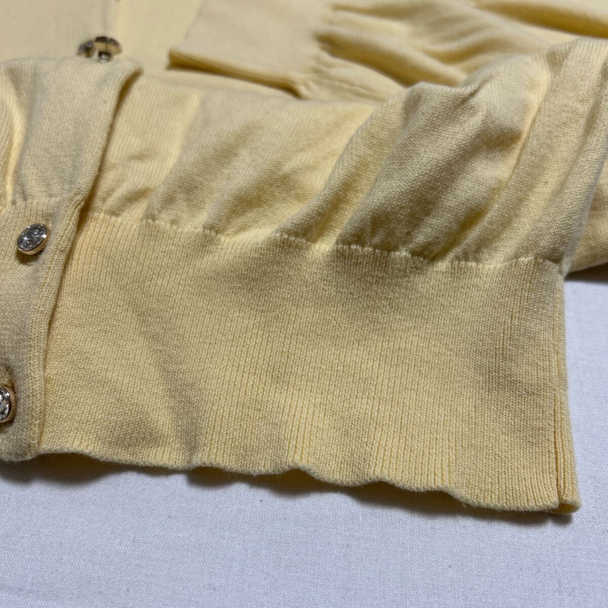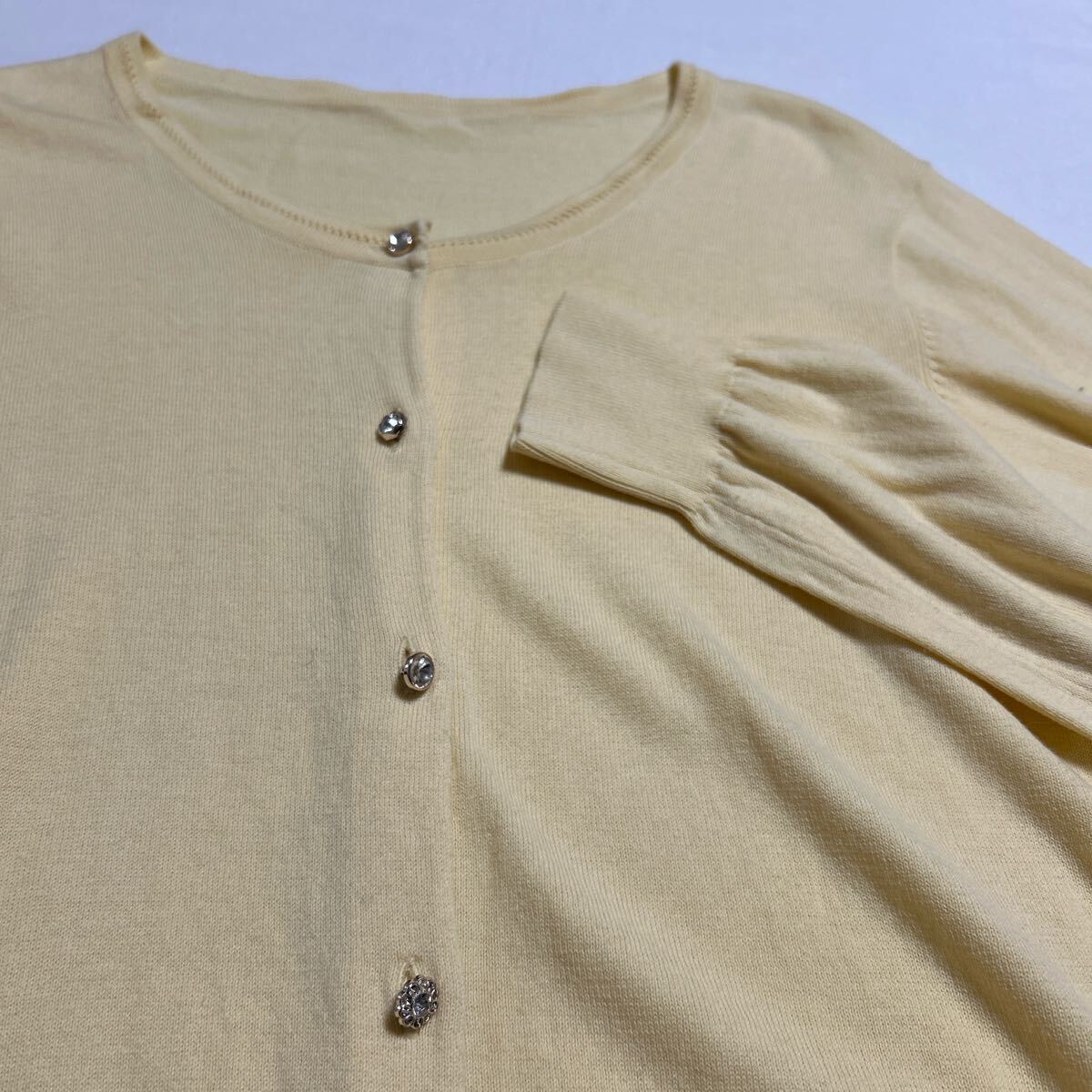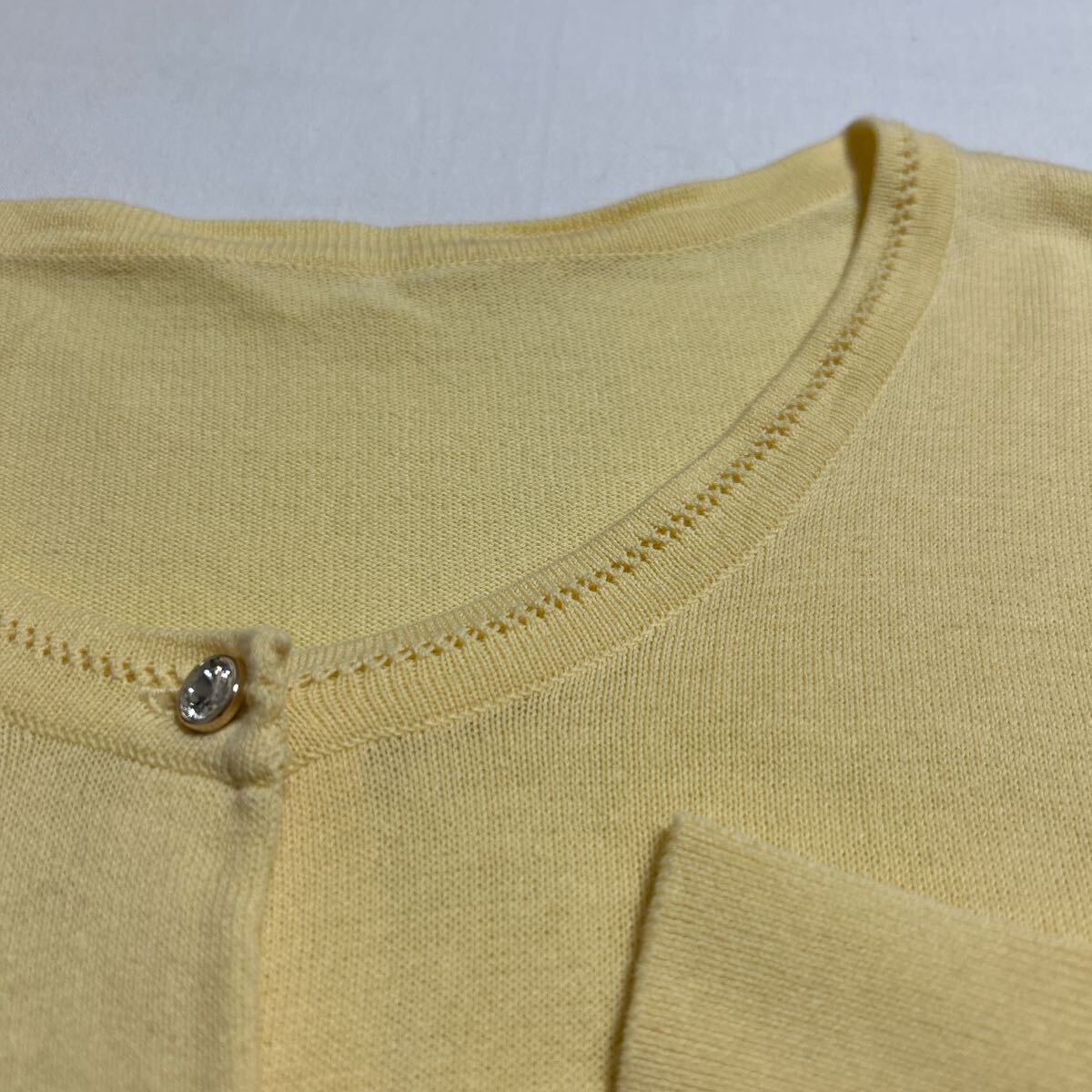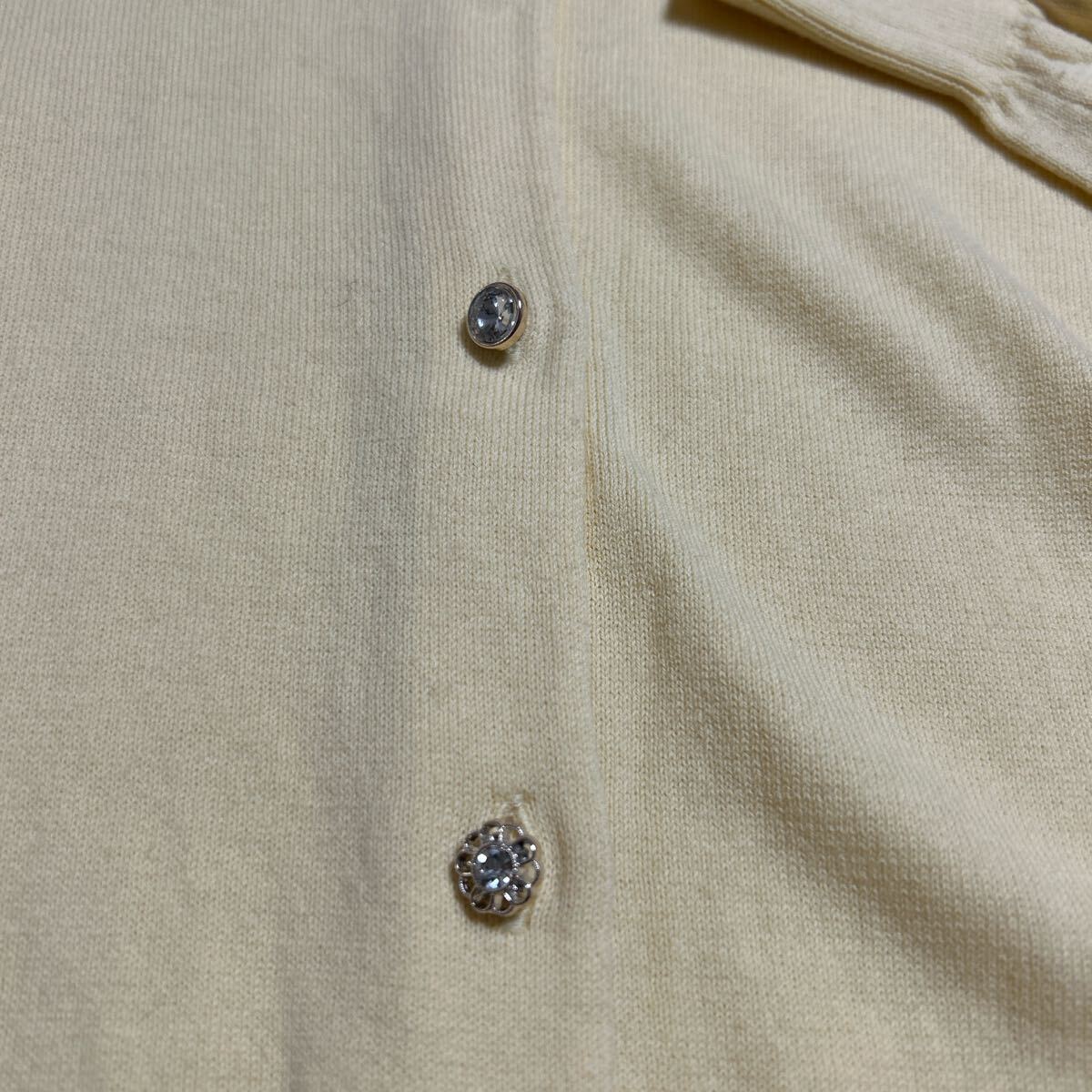 柔らかいニット素材のイエローボタン付きカーディガン、長袖デザインでリブ編み裾。 - 色: イエロー - デザイン: ボタン付きカーディガン - 素材: 柔らかいニット - 袖: 長袖 - 裾: リブ編み 着丈53、身幅48、肩幅37、袖丈57センチ。 目立ったダメージなどありません。 ご覧いただきありがとうございます。