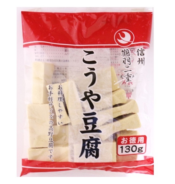 ★「鶴羽二重」のこうや豆腐です。標高およそ600メートル、東西を南アルプスと中央アルプスに囲まれた水と空気のきれいな地で、日量3000トンの豊富な地下水を使っておいしいこうや豆腐が作られております。ハーフカットですので、どの様なお料理にも使いやすいサイズです。ふくめ煮を始め、様々な料理にご使用ください。 ★栄養成分(100g当り)エネルギー 524kcal、たんぱく質 51.8g、脂質 34.3g、炭水化物 3.6g、ナトリウム 420mg、カルシウム 482mg、鉄 7.0mg、食塩相当量 1.1g。★煮物やサラダ、揚げ物に炒め物等、何にでもお使い頂けます。【湯戻しする場合】 1)お湯(50℃くらい)を用意し、こうや豆腐を浮かすように入れます。※注意:熱湯でもどさないでください。2)10分間程浸し、中まで十分に戻ったところで軽く絞ります。3)そのまま、またはお好みの大きさに切ってお使いください。★内容量 1袋130g×5袋 ★賞味期限 製造より6ヶ月★保存方法 常温 ★原材料 大豆(分別生産流通管理済み)、豆腐用凝固剤、重曹| 出价者 | 信用 | 价格 | 时间 |