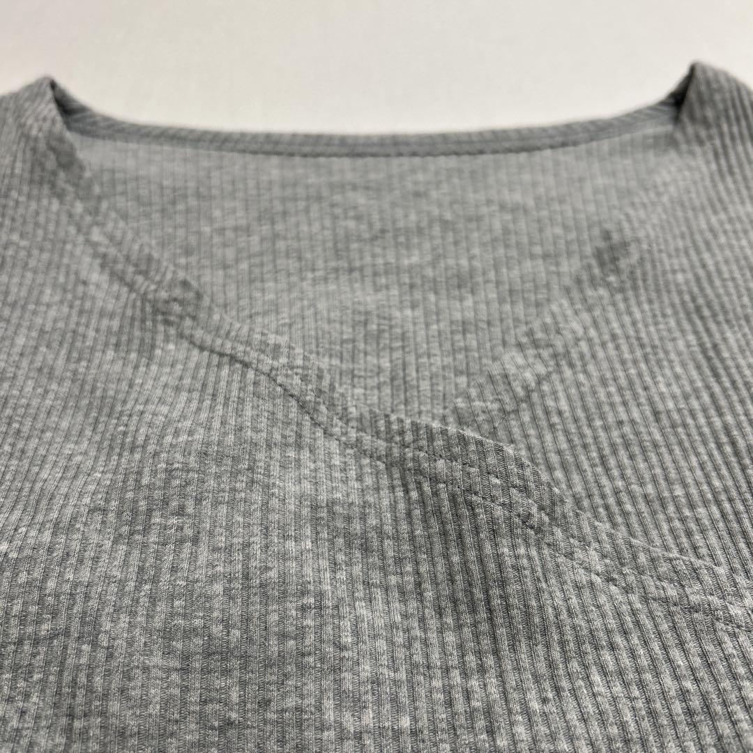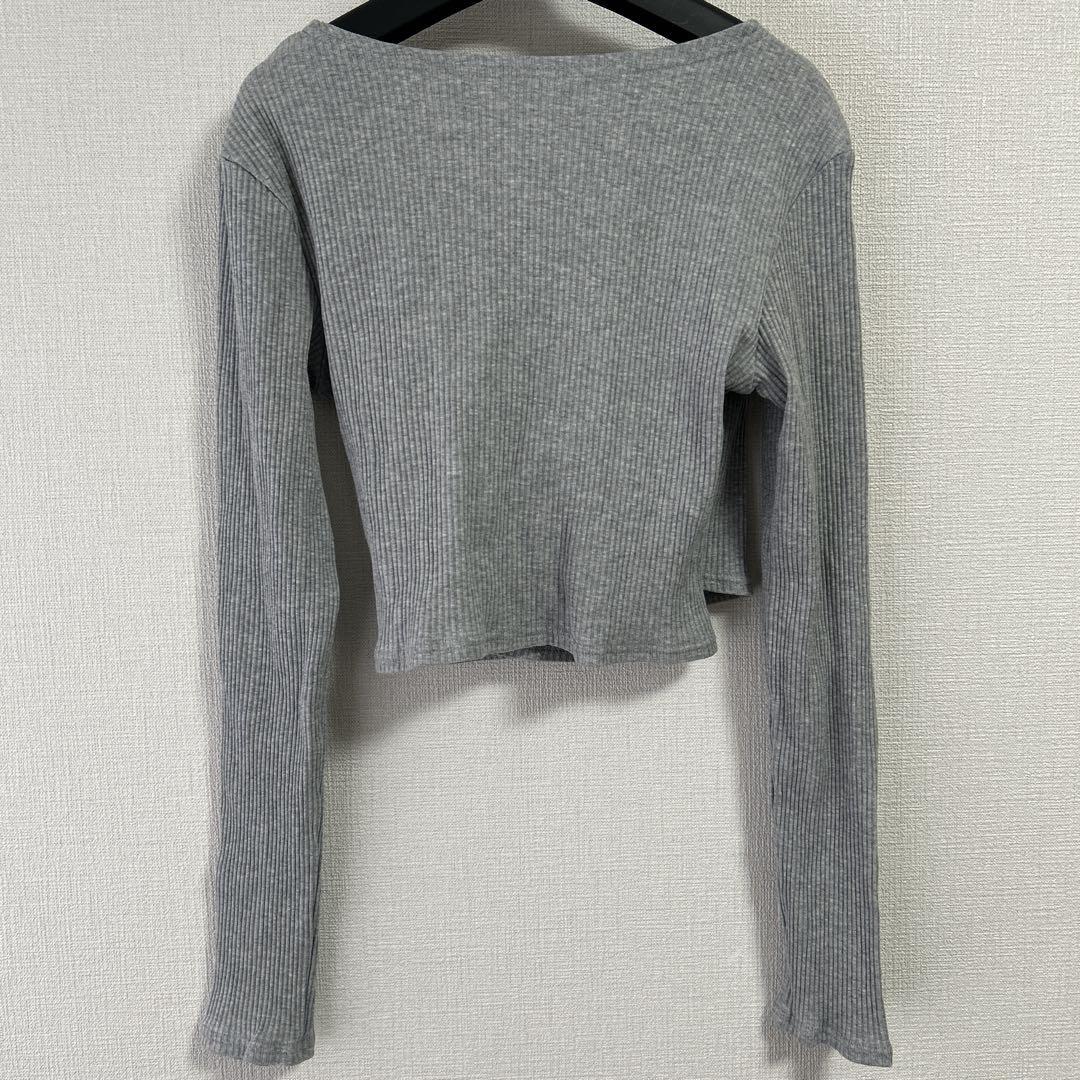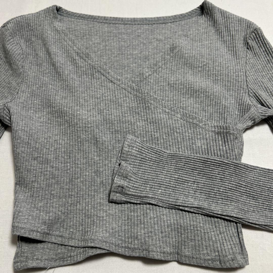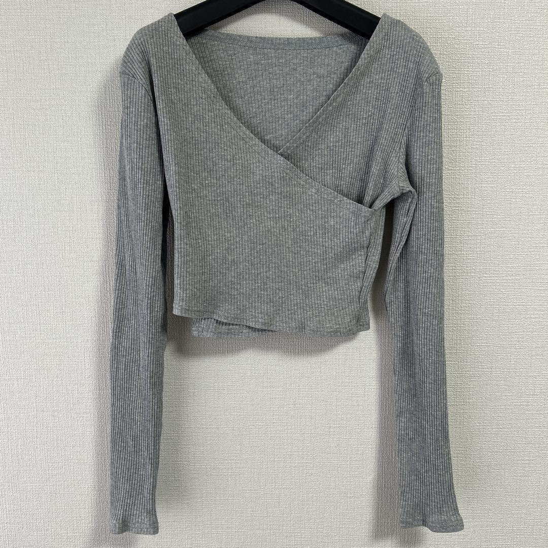 リブ編みのグレーのクロスオーバー長袖トップス、クロップドスタイルでスタイリッシュ。 - 色: グレー - デザイン: クロスオーバー - 袖の長さ: 長袖 - 素材: リブ編み - スタイル: クロップド 着丈35cm、身幅39cm、肩幅39cm、袖丈59cm 試着程度でダメージありません。 ご覧いただきありがとうございます。