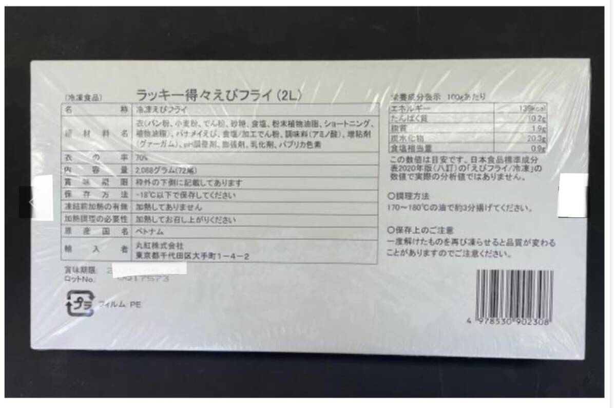 原材料、食品添加物 | 衣(パン粉、小麦粉、でん粉、砂糖、食塩、粉末植物油脂、ショートニング、植物油脂)、バナメイえび、食塩/加工でん粉、調味料(アミノ酸)、増粘剤(グァーガム)、pH調整剤、膨張剤、乳化剤、パプリカ色素 |