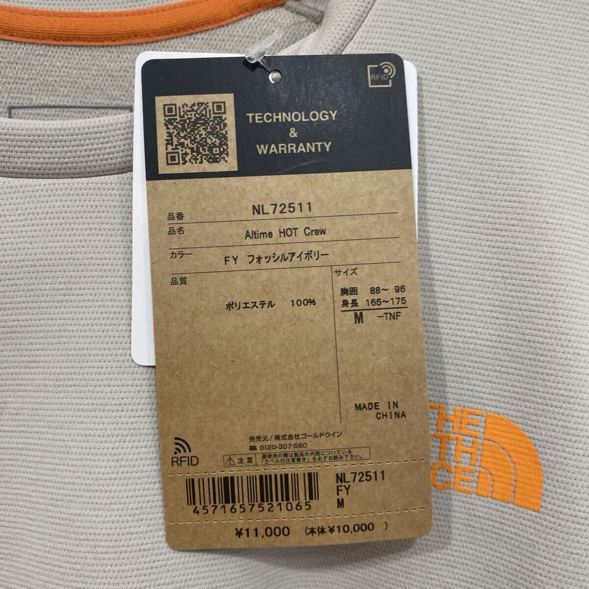 NL72511、オルタイムホットクルー、フォッシルアイボリー、Mサイズ、定価11000円、やや厚みがあるしなやかな生地は吸汗速乾と保温性に優れた中空・異形断面糸から組織され、軽くてあたたかく乾きやすいのが特徴です。肌面は起毛素材で保温性を考慮。一方で発汗量が多く熱がこもりやすい背中と脇下部分には、起毛のない生地を配置しています。ゴールドウィン正規品、着丈約70cm、身幅約50cm