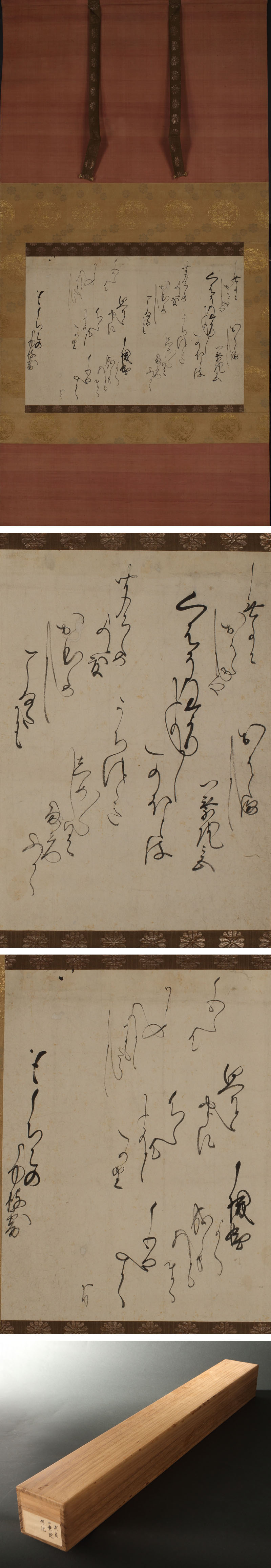 江戸中期の女房奉書です。 禁裏の勾当内侍が「一乗院宮」の御児衆に宛て発給した消息で、「しめしめしき」雨天が相続く中、「くはう(公方)様」が宮の無事を案じている旨の伝達を依頼する内容となっております。 「くはう様」は江戸時代に将軍を指す語として一般的でしたが、勾当内侍が発給する女房奉書では猶「院(上皇)」を指す語としても用いられていたことが陽明文庫所蔵の女房奉書および『中院文書』や『開口神社史料』などより判明します。幼帝や女帝の即位期間中、実質的に上皇(法皇)が朝廷を掌握した近世において、この形式の女房奉書は実質宝永年間(1704-1710)霊元天皇・東山天皇期の発給がピークとみられます(大谷俊太・大山和哉「京都大学文学部蔵中院文書文学関連資料翻刻(中)」)。 問題は「くはう様」が霊元・東山いずれを指すか、および「一乗院宮」が真敬法親王・尊賞(尊昭)法親王いずれを指すかにより女房奉書の意味合いが変わってくることであり、『中院文書』においても「くはう様より申候~」より始まる両者が発給した女房奉書、および仙洞女房奉書が混在することが知られます。本作はその中でも『開口神社史料』所載の「宝永七(1710)年十一月廿八日東山天皇女房奉書」に筆跡の類似がみられますが、宝永7(1710)年は東山院崩御の翌年であり、正しくは幼帝中御門天皇即位に伴う霊元上皇の院政復帰後の女房奉書と推察され、陽明文庫所蔵の東山天皇期の大半の女房奉書などと筆勢が異なることからも、実質的に霊元院の仙洞女房が代理で認めたものではないかと考えられます。 本書状が霊元上皇の意向を汲んだものとして、宝永6(1709)年7月以前のものとすれば、里坊療養中であった実兄一乗院宮真敬法親王の容態を案ずる書状、それ以降とすれば門跡を継いだばかりの実子尊賞法親王の無事を案ずる書状であると考えられます。いずれにしても、元禄期前半(1690年代)に朝廷内の権力闘争に敗れ政治力を削られた霊元院が、東山天皇譲位~崩御前後に禁裏の文書発給・取次機構である長橋局の掌握に動いていたことを示す書状であるといえるでしょう。 流麗な書様に、宮中の暗闘の歴史が読みとれる逸品です。 ◆一乗院宮真敬法親王 江戸前期-中期,後水尾天皇の第16皇子。母は新広義門院。明暦4(1658)年親王となり,翌年興福寺一乗院の尊覚法親王のもとで得度。寛文5(1665)年興福寺・清水寺別当をかねる。書,狩野派の画にすぐれた。宝永3(1706)年没、58歳。幼称は富宮。俗名は常淳。法名ははじめ信敬。著作に「唯識三十頌錦花」など。 ◆一乗院宮尊賞法親王 江戸中期の親王。霊元天皇の第十三皇子。名は庶賢、幼称は多喜宮、法諱は初め尊昭、のち尊賞と改める。興福寺一乗院に入寺、親王宣下を受ける。のち二品に叙せられ興福寺別当となる。延享3(1746)年薨、48歳。 〔本文〕 くはう様より申へく候、このほとは/うちつゝきしめゝゝしく雨天にて/おはしまし候、一乗院宮 御無事におはしまし候や、/御機嫌よく成らせまいらせ候まゝ、御心やすく/聞こしめされ度おほしめし候、こなたにも/思召候やうに心えよし申とてこの由/ 御心え候て可申入候、めてたくかしく より 御ちこのしゆ披露 付属: 寸法:高さ115cm、幅57cm(最大幅。若干の誤差はご了承下さい) 状態:スキャンがございます。 |