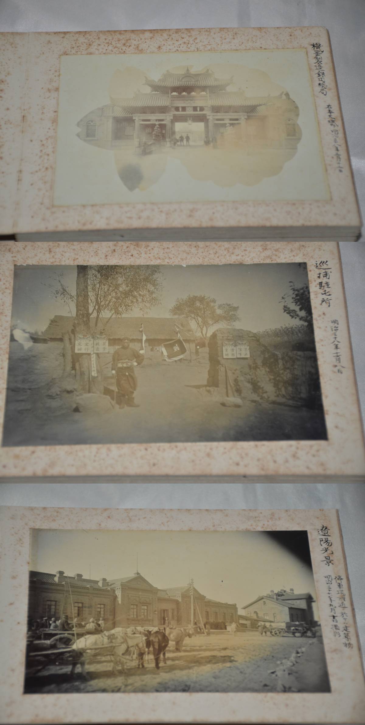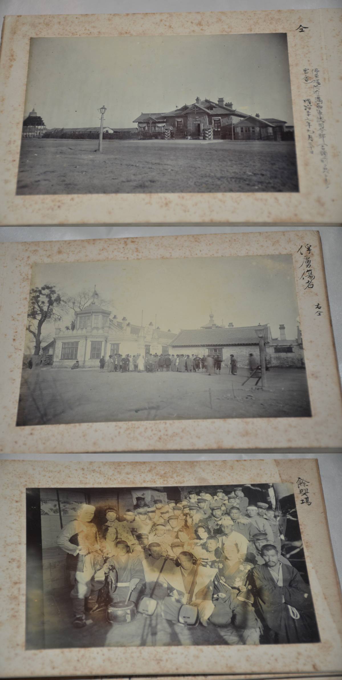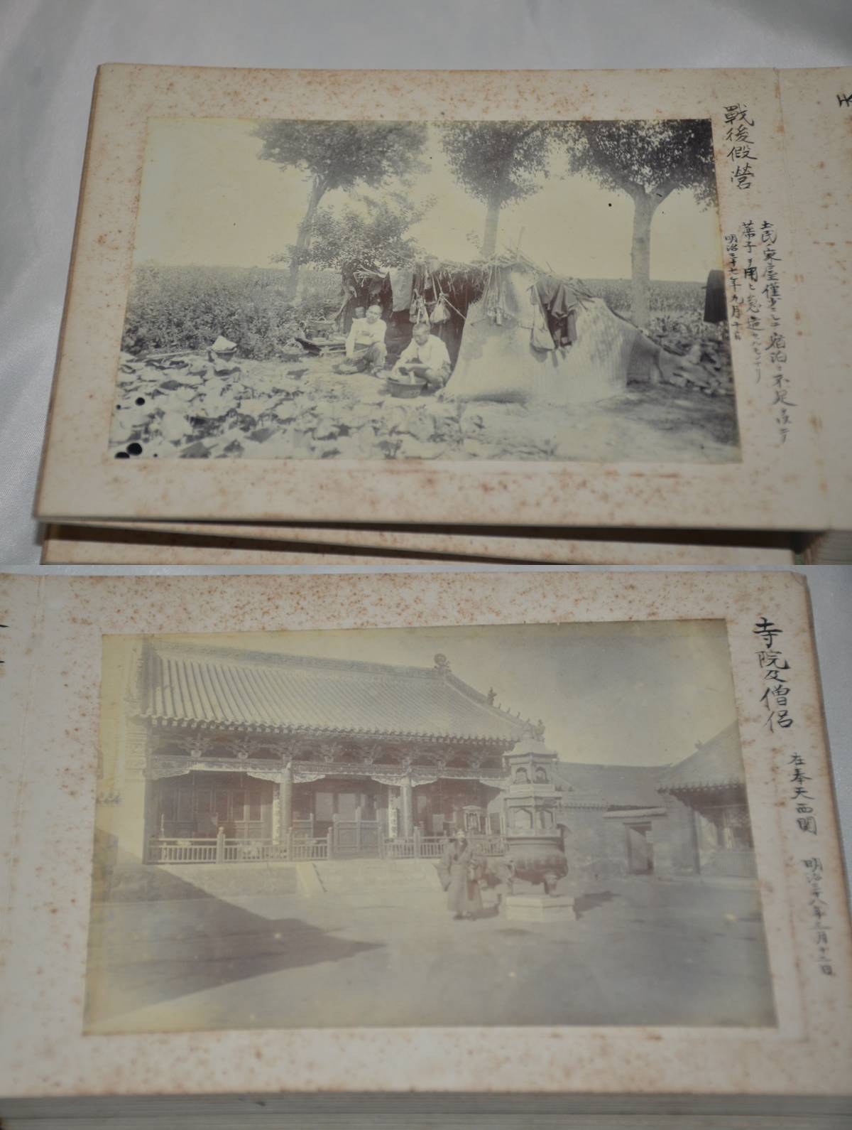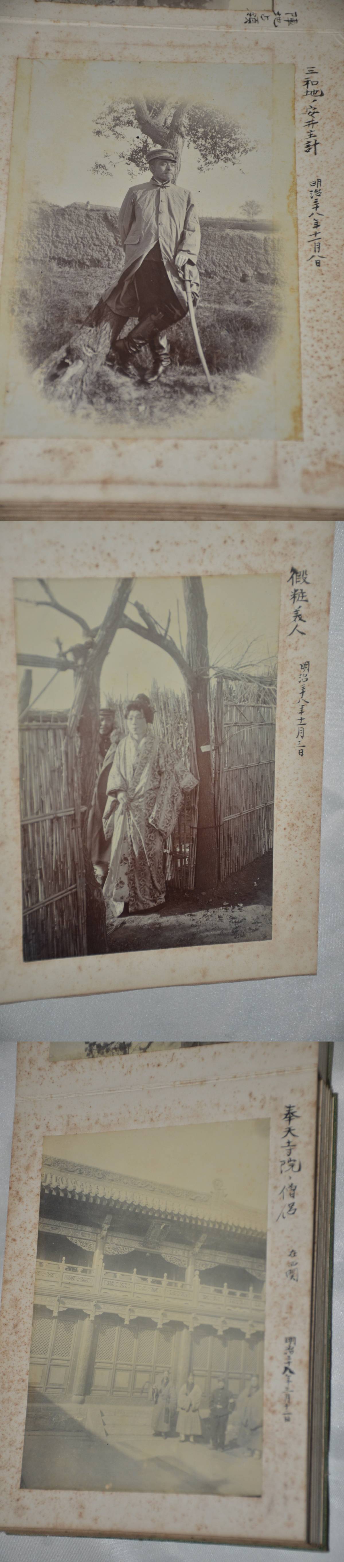 日露戦争時軍医総監所持生写真帖です。別冊出品に、日露戦争時軍医総監所持との古書店メモがありました。軍医団 病院将校 兵士宿営 遼陽 奉天寺院、民間人写真、捕虜、戦死者、手術の写真があります。ガイドラインがありますので、戦死者3枚、手術2枚の写真は掲載しておりません。サイズは、13.5センチ×18.5センチ×4.5センチ41枚生写真が貼って振ります。本文下の追加写真もご覧ください。ヤマト運輸宅急便で、全国一律700円でお送りさせていただきます。