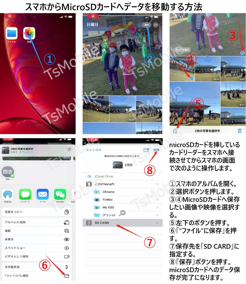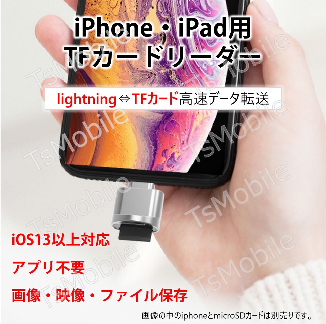 | 「本商品はios13以降のシステムのみ対応しますので、予めご了承ください。」 【Lightningコネクタオスのカードリーダー】iPhone,iPadで使うライトニングコネクタ式カードリーダー。microSDカード(TFカード)スロット。 【様々なシーンで大活躍】メモリーカードやデジタルカメラからiPadやiPhoneに簡単に写真やビデオを取り込めます。iPadやiPhoneにある写真もMicroSDカードに書き込みができます。 写真や動画、word/Excle/PPT/PDFなどのファイルも転送可能です。 【使用方法が超簡単】PCでの設定やアプリのダウンロードなどが一切ありません。TFカードをリーダーに差し込むとiPadやiPhoneの「ファイル」というアプリケーションでMicroSDカードの内容が確認できます。 【対応カード】 Micro SD / Micro SDXC / Micro SDHC等(最大256GBまで)メモリーカード対応します。 【対応機種】IOSが 13.0以降であり、ライトニングジャック搭載のiPhone11/iPhone11Pro/iPhoneX/iPhone8/iPhone8plus/iPhone7/7plusなど、iPad mini/Air/pro9.7/pro10.5/pro12.9に対応します。 |
