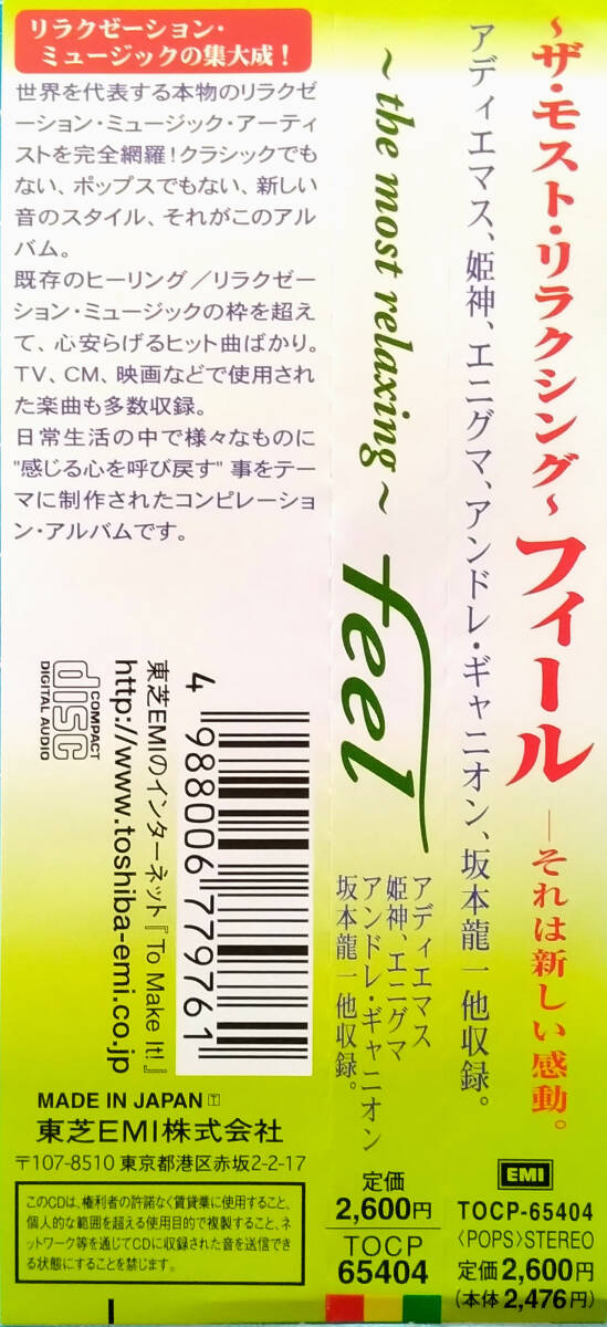 +++++++++++++++++++++ ◆送料◆ ゆうパケット(匿名配送) 全国180円 +++++++++++++++++++++ アーティスト:Various(V.A.) タイトル:~ザ・モスト・リラクシング~フィール 発売日:2000年3月23日 規格品番:TOCP-65404 JANコード:4988006779761 収録曲数:18曲 収録曲(抜粋) 1. 世紀を越えて / アディエマス 2. 神々の詩 / 姫神 3. 祈り / シークレット・ガーデン 4. リターン・トゥ・イノセンス / エニグマ 5. 運命と絆 / ウォン・ウィン・ツァン ----------------------- ◆付属品・状態◆ ・中古品 ・歌詞カード(ブックレット) ・帯あり ・ケース・盤面に細かな傷・汚れがあります ・再生未確認 ・レンタル落ちではありません ----------------------- ◆ご注意◆ ・梱包はリサイクル材を使用する場合がございます ・撮影環境やモニターにより、実際の色味と多少異なる場合がございます ----------------------- ◆ご面倒ですが【自己紹介欄】は必ずご覧ください。 |