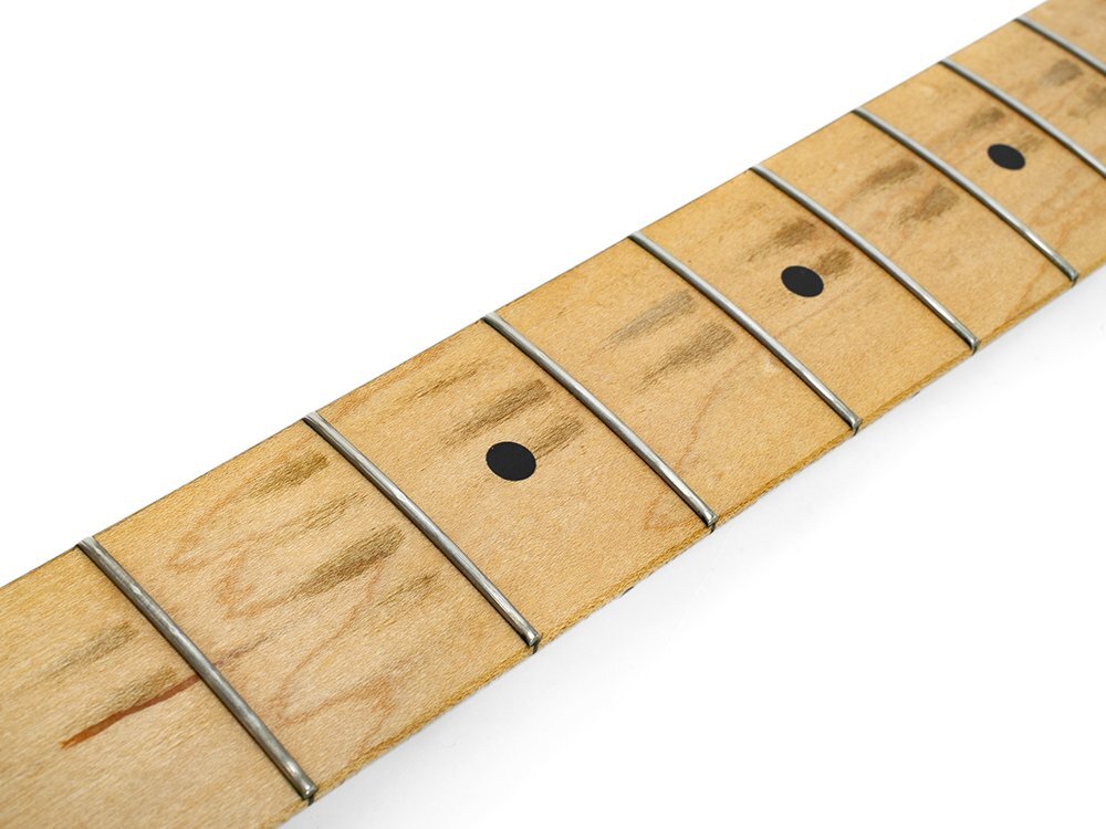 特に大きなキズや破損、メッキの剥げなどは見当たりませんでしたが、ボディの各所に小キズやスレ、ブリッジ左下部に打痕があり、指板にもスレが目立つなどの使用感があります。アンプを通して音を出してみましたが、スイッチ、トーン、ボリュームとも異常ありませんでした。当店でのお買取時に2016年前後頃に購入した事とピックアップやサドルのパーツを交換している事をお聞きしました。外したパーツは付属していません。 |