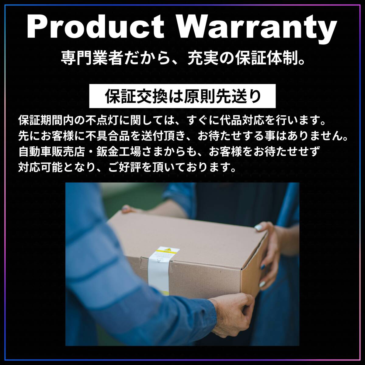 | 注意事項 | ※色味やイメージなど主観によるもの、適合違いなどお客様都合のもの、ノイズなど車の個体差や取付状況に左右されるものは保証適用外になります。 ※車検対応に関しては100%が無く、車体との相性やテスター・検査官の差も含まれます。保証適用外となるため万一の際はハロゲン球に戻して検査してください。 ※代品に対する追加の保証延長や、取付、加工に掛かる工賃・車体への保証は致しかねます。 ※車体都合の不点灯や警告灯・チラつき(輸入車やHV車特性等)には当方で対処しかねます。 ※汎用品ですので適合には充分にお気をつけの上、商品特性へのご理解と愛車への知識を持ってご購入頂けますと幸いです。 ※特定商取引法に関する表示は自己紹介欄をご覧ください。 |