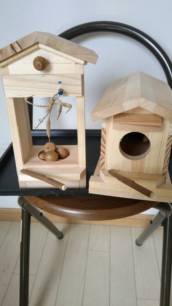 (0928ー4)① 小鳥(野鳥の巣箱)ECO溝左右3本入りの簡単説明。初春用の季節 時間を身近に感じとれるECO溝3本入りの巣箱が蒸れにくい造りの内装とまり木タイプの商品です。大きさ内寸約70ミリΧ170ミリの長方形 床面から屋根裏約110ミリ 小鳥の入り口約40ミリ丸 内装とまり木タイプ 小鳥の入り口稼働式とまり木タイプ 材質木製 稲穂1本付き  ② 小鳥 小動物の餌場の簡単説明。商品に小鳥の餌 小動物の餌を入れ餌を食べにくる所を鑑賞 観察して楽しむ商品です。商品の大きさ内寸約70ミリΧ80ミリの長方形 床面から屋根裏まで約160ミリ 餌入れ約50ミリ丸 餌1回分 材質木製 ☆送料消費税込み 発送 ヤクネコおてがる配送扱い 発送2~3日で可能 (ノークレーム ノーリターンでお願いいたします)