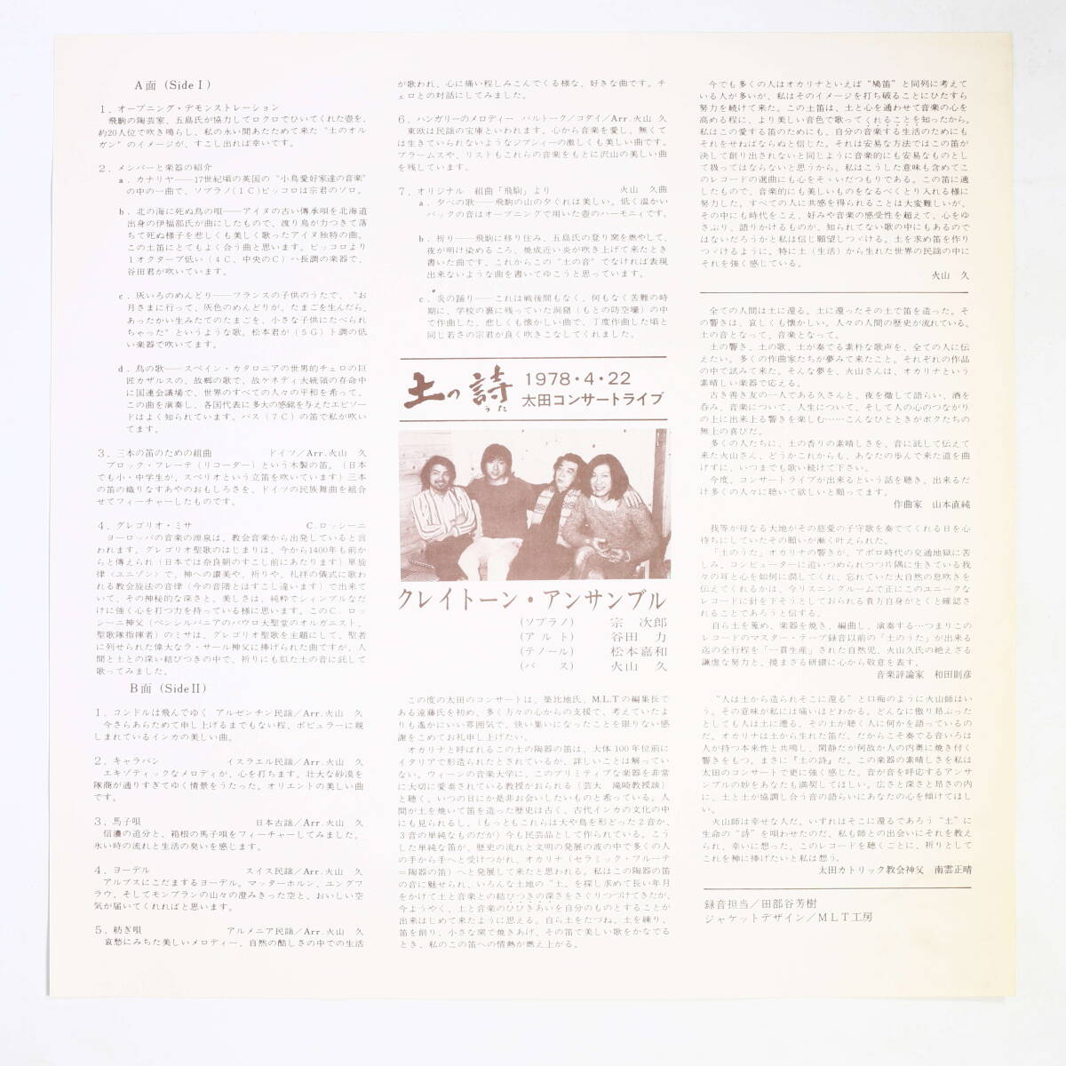並良品 元々帯なし ライナー付(やけ小) 会員頒布・非売品・自主盤 署名入り(真作,宛て書きあり) コンサートプログラム付(1978年7月2日,足利市民会館大ホール) クレイトーン・アンサンブル(ソプラノ:宗次郎,アルト:谷田力,テノール:松本壽和,バス:火山久)