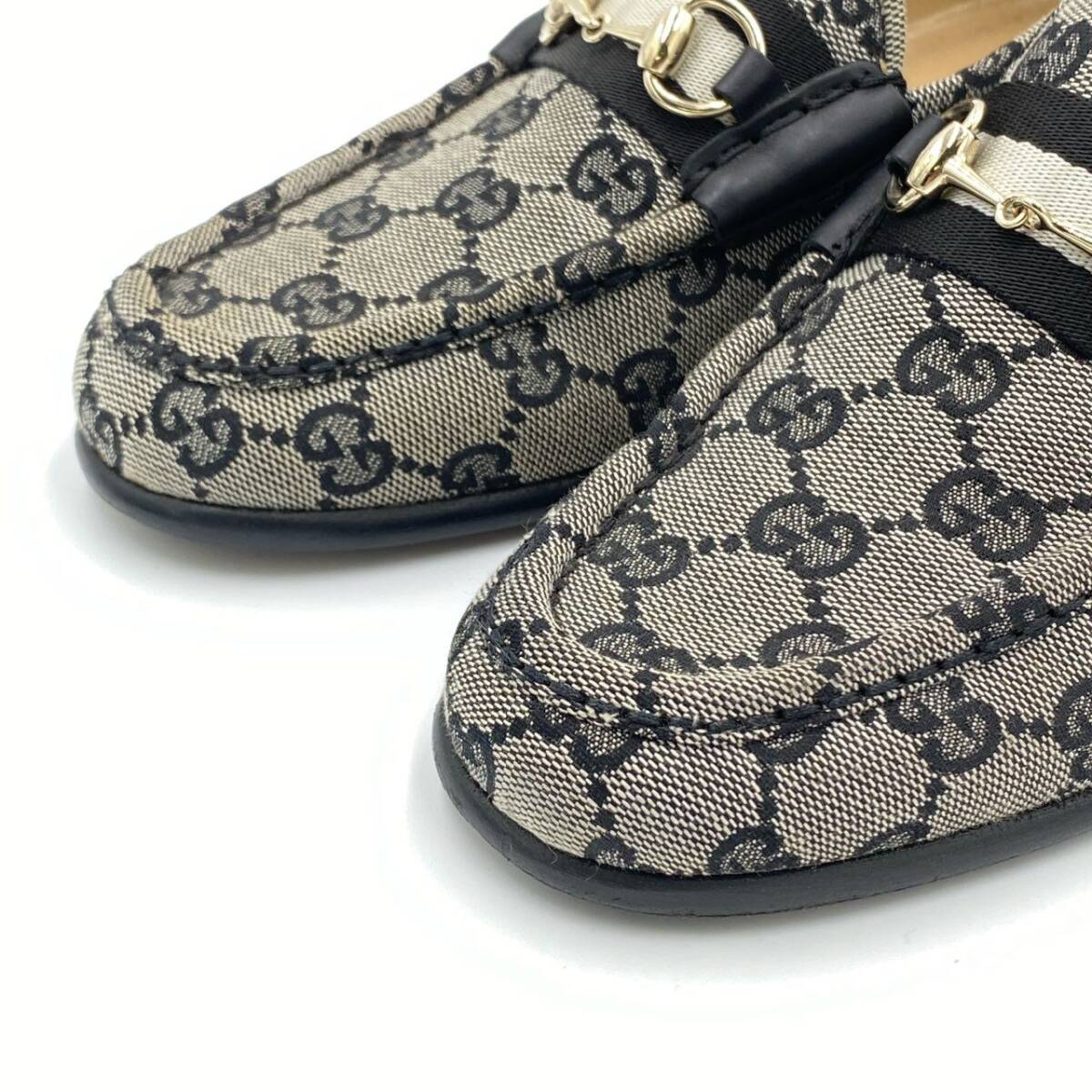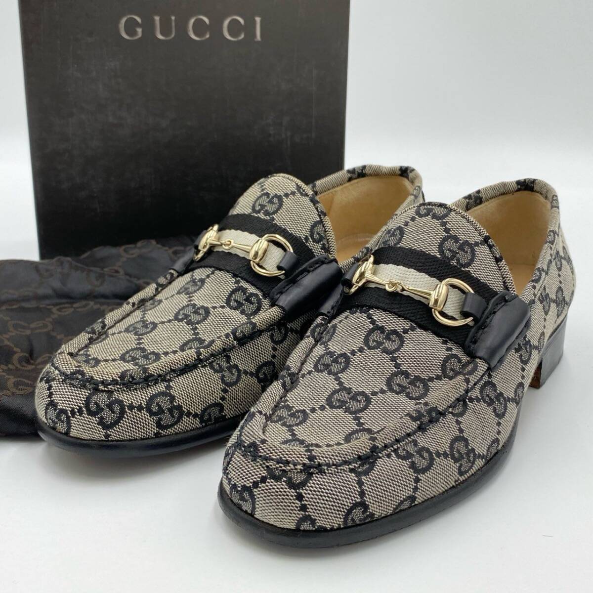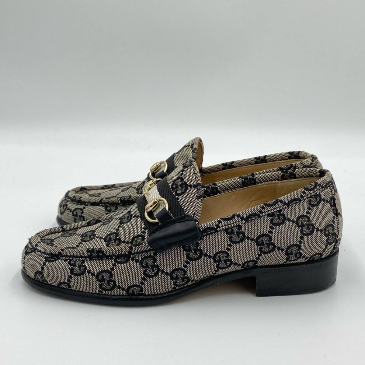 | スタッフ商品コメント | グッチの「ホースビット GGシグネチャー」ローファーは、グレー×ブラックのGGモノグラムキャンバス地に、ゴールドのホースビット金具が映えるクラシカルな一足。マットなコットンキャンバス素材に、艶のあるレザーとストライプリボンがアクセントを加えています。ヒールは2.5cmで安定感があり、通勤からカジュアルな外出まで幅広いシーンで活躍。ブランドらしさを感じられる、上品かつ実用的なレディースローファーです。 |