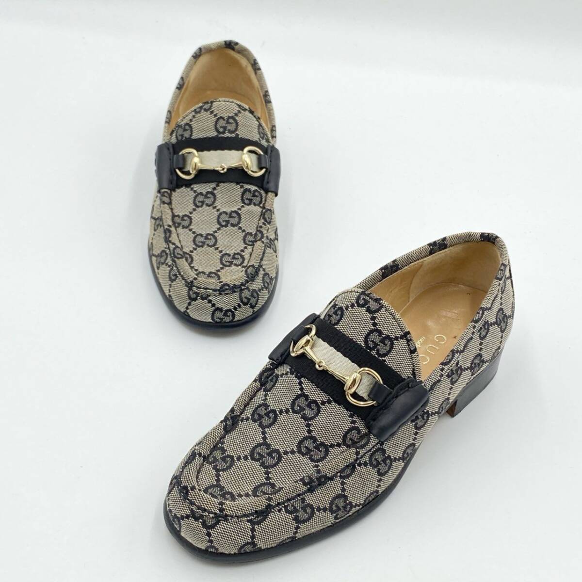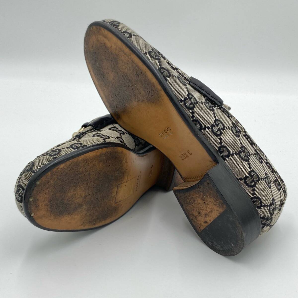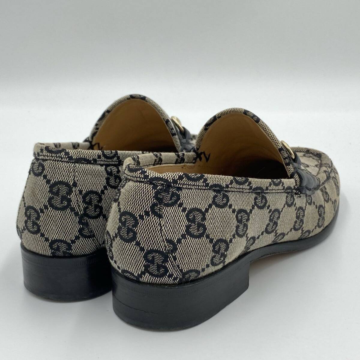 | スタッフ商品コメント | グッチの「ホースビット GGシグネチャー」ローファーは、グレー×ブラックのGGモノグラムキャンバス地に、ゴールドのホースビット金具が映えるクラシカルな一足。マットなコットンキャンバス素材に、艶のあるレザーとストライプリボンがアクセントを加えています。ヒールは2.5cmで安定感があり、通勤からカジュアルな外出まで幅広いシーンで活躍。ブランドらしさを感じられる、上品かつ実用的なレディースローファーです。 |