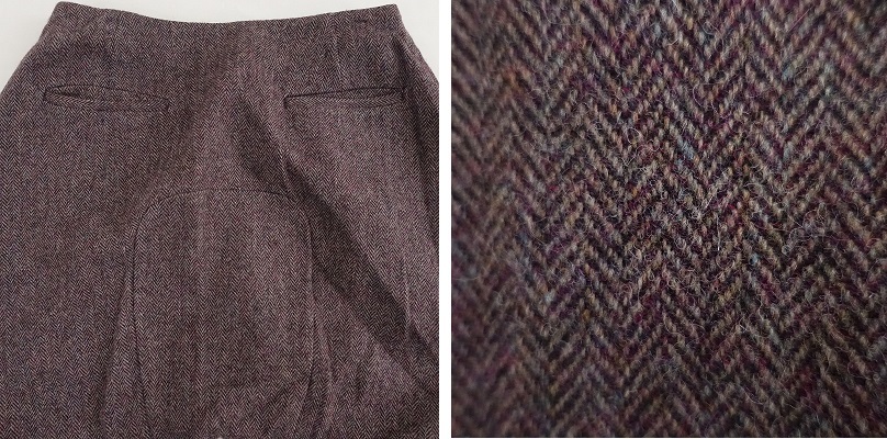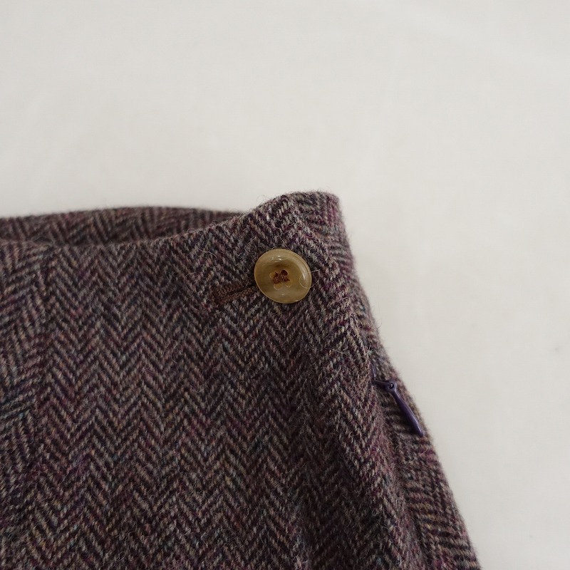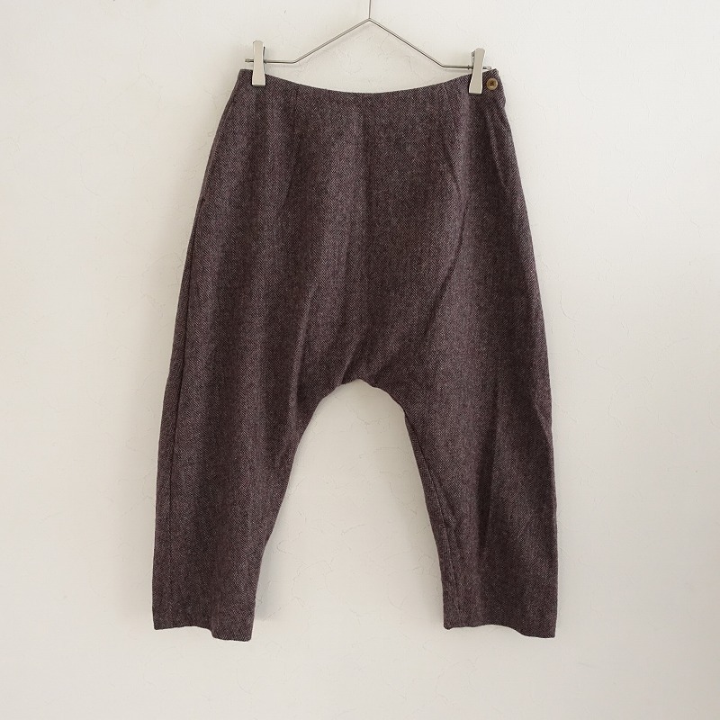 | Lisetteのヘリンボーンサルエルパンツです。カラーはボルドー系のヘリンボーンで、ウール地で仕立てられ、裏地付きです。左サイドのボタンとファスナーで着脱でき、定価(メーカー希望小売価格) 32,400円の商品です。 |