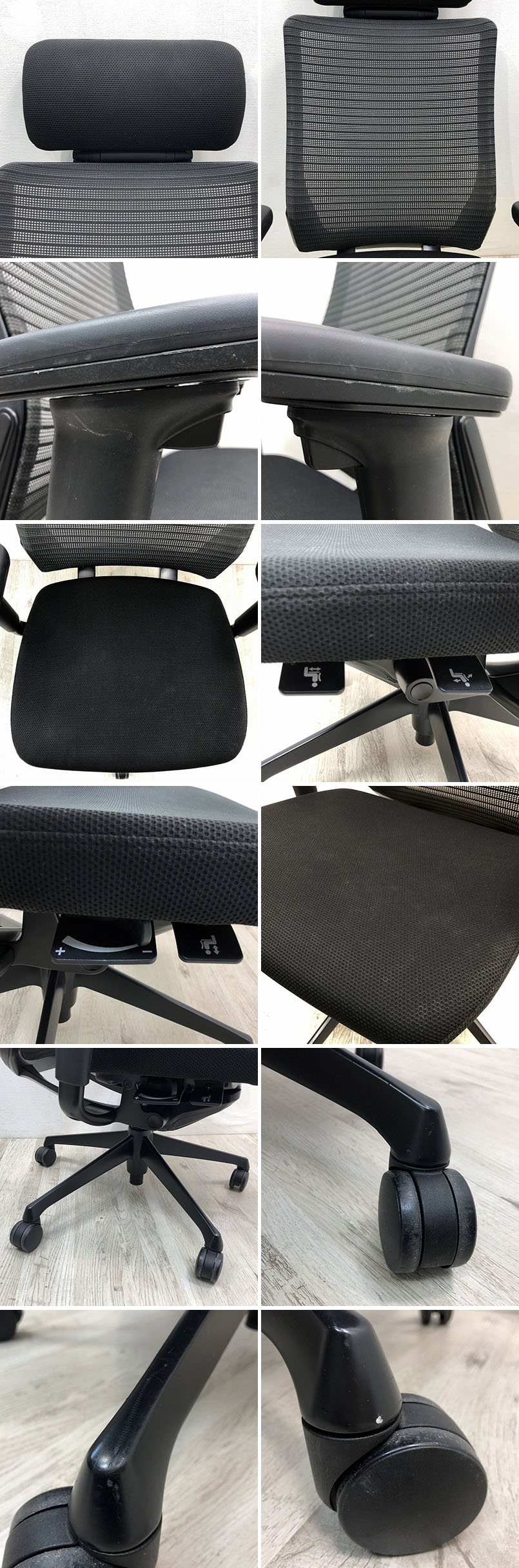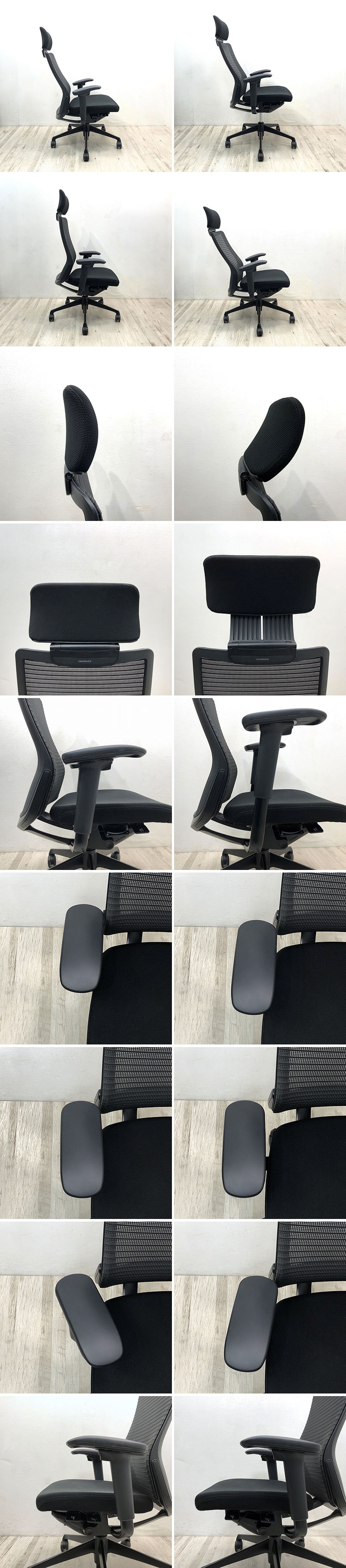 こちらはOKAMURA オカムラ Choral コーラル オフィスチェア エクストラハイバック ヘッドレスト付き CQ8AMR FSH1です。 中古品です。 シンプルなスタイリングに、充実の機能を搭載。 Choral=「合唱の」という名にふさわしい、 オフィスに調和するシーティングです。 ■アンクルチルトリクライニング くるぶしを中心として、背と座がシンクロしてスライドするアンクルチルトリクライニング。 リクライニング時にも、太腿などを圧迫することなく、自然な姿勢をサポートします。 ■リクライニングの強弱調節 「クイックスライドオペレーション」を採用し、座面右下のレバーをスライドさせるだけで、 リクライニング反力の強弱調整が行なえます。 座ったままの状態でお好みの強さに簡単に調節が行なえます。 ■アジャストアーム(4D) これまでの肘パッド部の上下(1D)、回転(2D)、前後(3D)の動きに加え、幅方向(4D)の調節が可能です。 【コンディションについて】 多少の使用感や小傷があります。 ![]() 各種機能の動作確認済みです。 【主な機能】 座面高さ調節(ストローク100mm) アンクルチルトリクライニング(リクライニング角度23度・任意位置固定可・強弱調整可) ヘッドレスト高さ調節(100mm)と角度調節 (35°) アジャストアーム(4D) 座面奥行き調整(ストローク50mm) 詳細につきましては下記画像も併せてご参照ください。 ![]() 再良市場の他のお品物はこちらから!