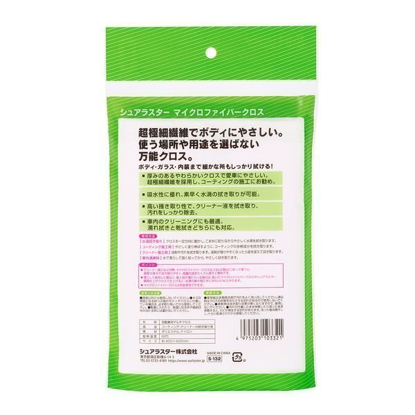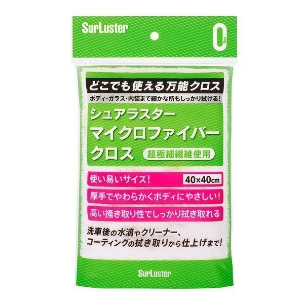 ●吸水性に優れているので、洗車後の水分の拭き取りようとしても使用できます ●シュアラスターの ゼロコーティングシリーズ、固形ワックス、クリーナーの拭き取り・ 仕上げに最適です 水分が残っていてもワックス・コーティングをすばやく拭き取ります 吸水性に優れているので、洗車後の水分の拭き取りようとしても使用できます ●ダッシュボードや内窓等、内装のお手入れなどオールマイティにご使用頂けます