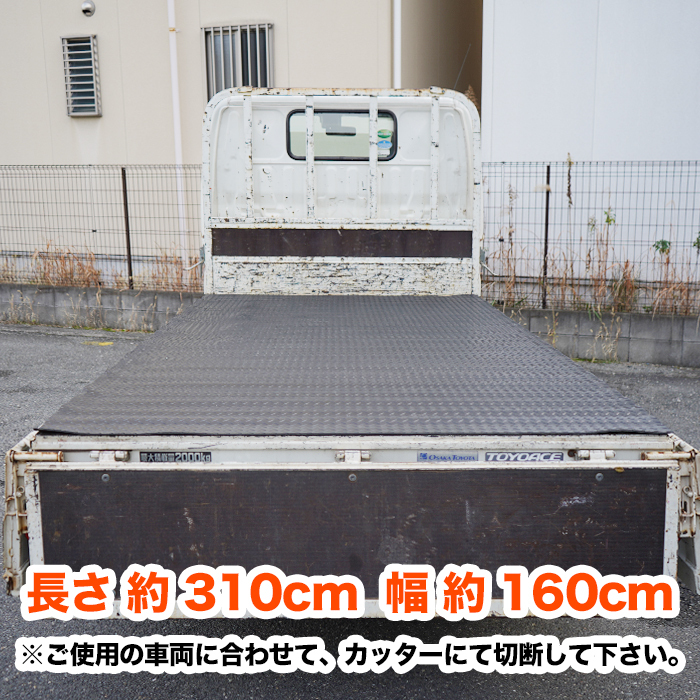 | 荷物の滑り止めや荷崩れ防止、積荷と荷台の傷防止対策として安心してご使用いただけます!! 耐久性に優れた合成ゴム製のため、雨や泥で汚れても丸洗いOK!! ■適合 ・2tトラック(荷台内寸が長さ約310cm×約160cmのサイズに適合します。) ※商品画像はトヨタ トヨエース・ダイナ2t標準(平ボディ)にて撮影しております。 ※画像にてサイズをご確認の上ご購入下さい。 ※サイズが合えばその他車種も取付可能です。 ※カットしての装着も可能です。 ■素材:合成ゴム ■サイズ:約310cm×約160cm×厚さ約5mm ■重量:約30kg ■デザインタイプ ・Eタイプ 【注意事項】 ※ゴム特有の匂いがしますので気になる場合は 中性洗剤等で水洗い後、数日間天日干しを行って下さい。 ※カット後の返品、交換等は一切お受けできません。 |