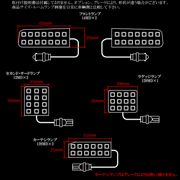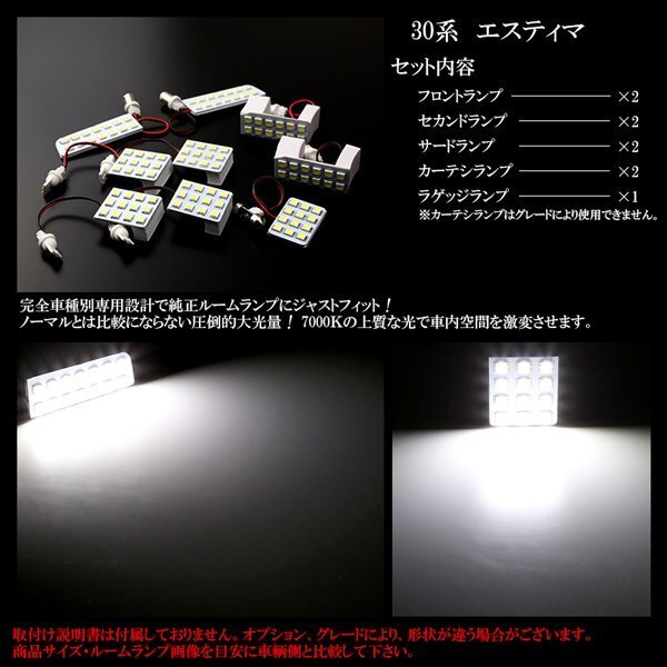 ACR/MCR 30系40系 エスティマ LEDルームランプキット 9pc 可能な限りLEDを詰め込み、バルブ交換では味わえない驚きの明るさ。 約7000Kの純白光で極上の車内空間を演出します。 他の車種は⇒ こちら その他、30系エスティマパーツは⇒ こちら カーテシランプはグレードにより使用できません。 取付説明書は付属しておりません。 オプション・グレードにより、形状が違う場合がございます。 商品サイズを目安に車輌側と比較して下さい。 |