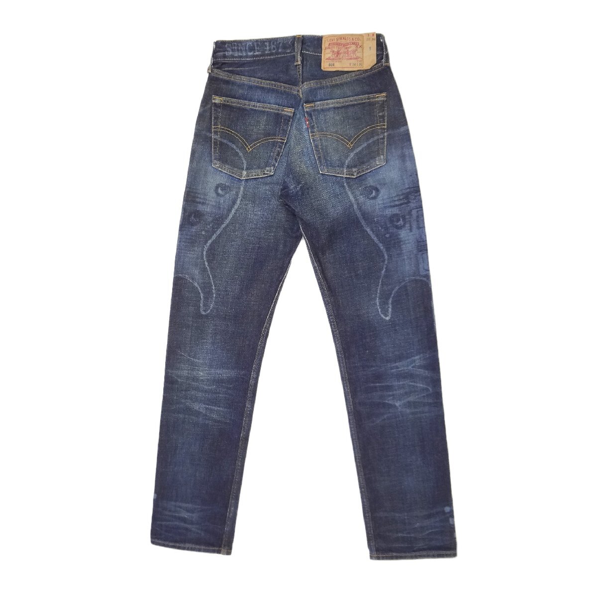 リーバイスのレーザープリント501、実店舗の店頭展示品を1度クリーニングしただけの未使用品、Levi'sジーンズ、ジーパン、細くないストレート、インディゴブルーデニム綿100%、レーザープリント付き