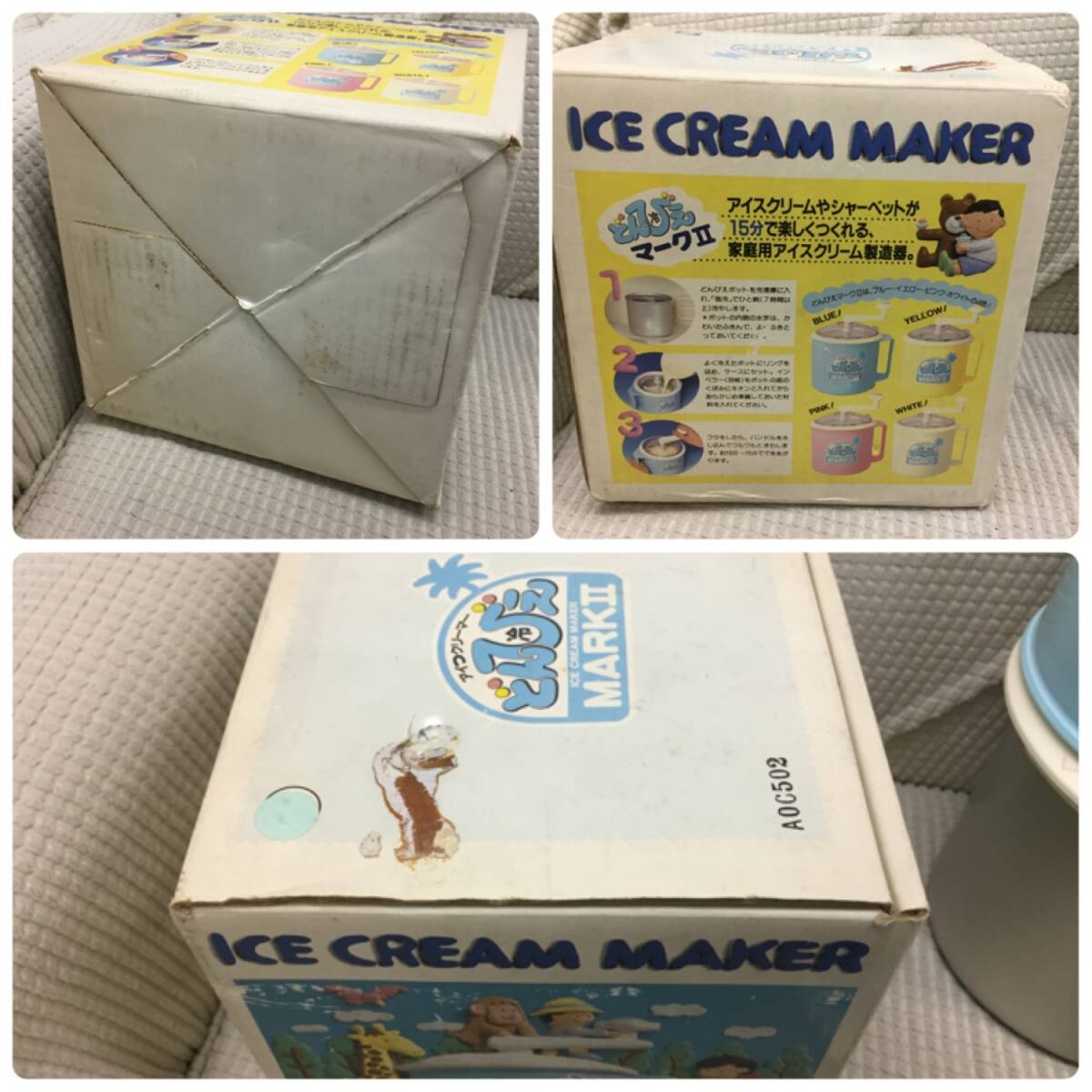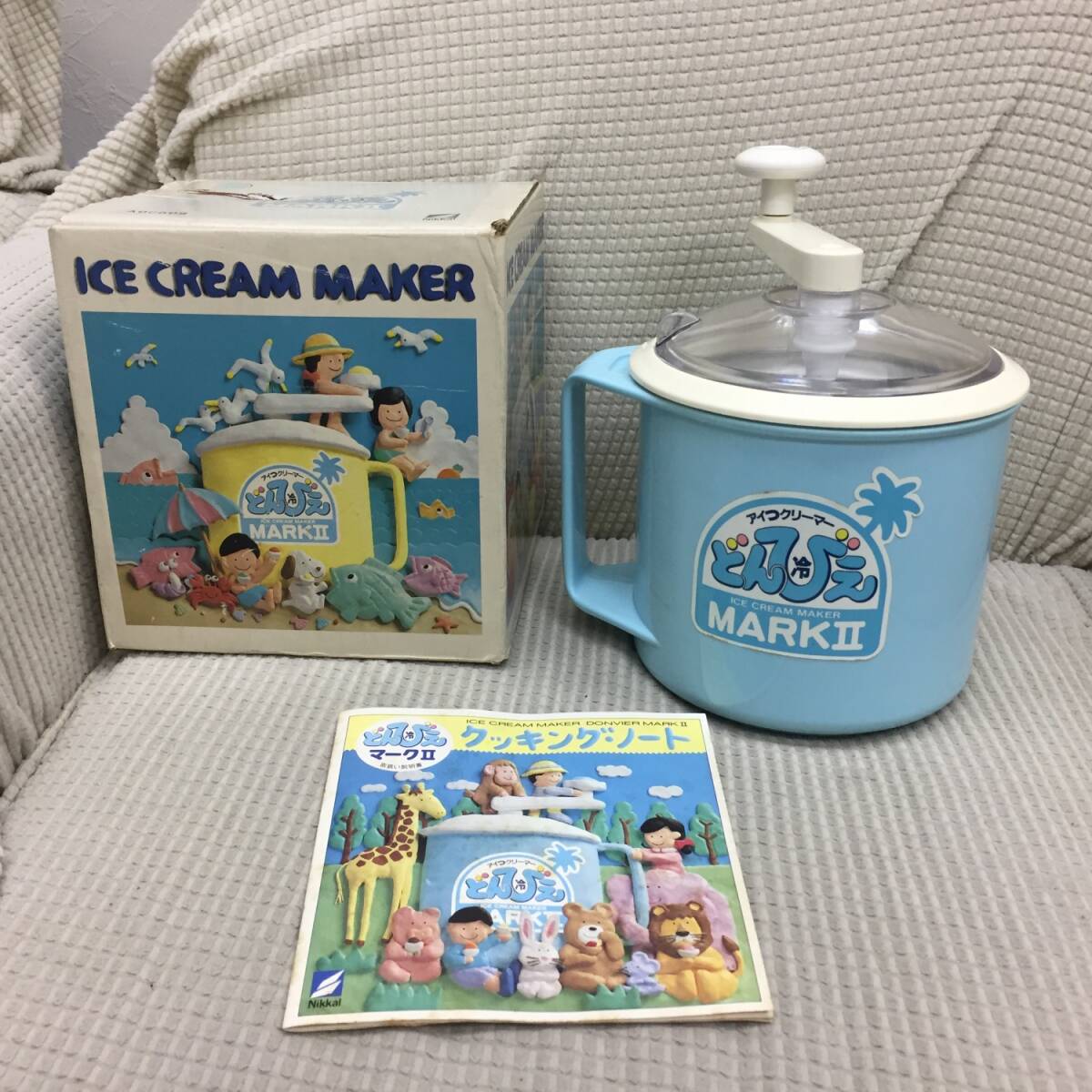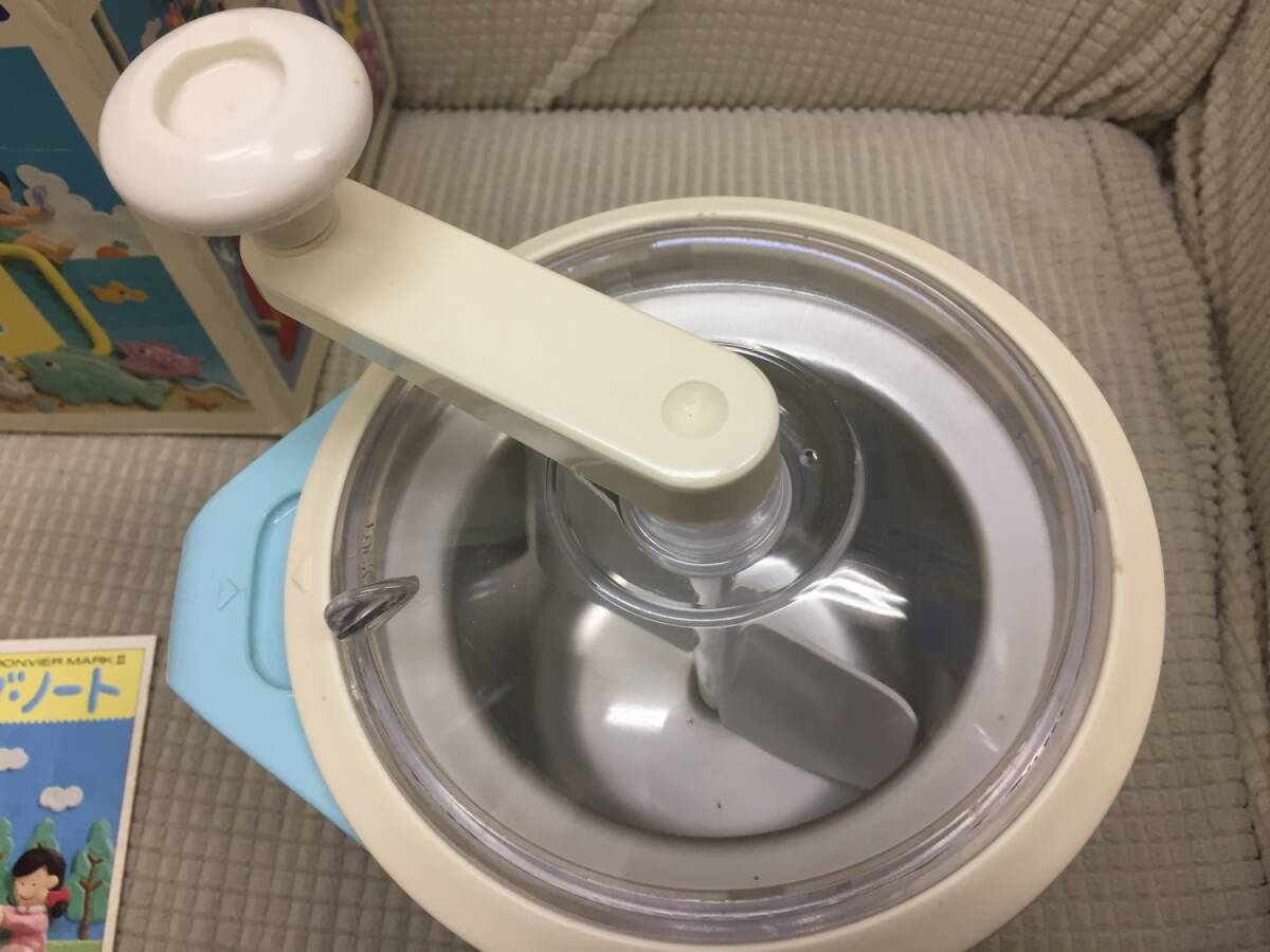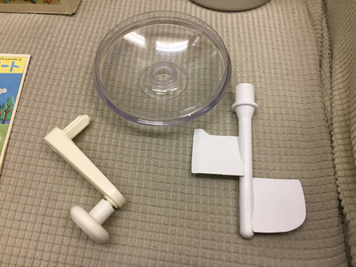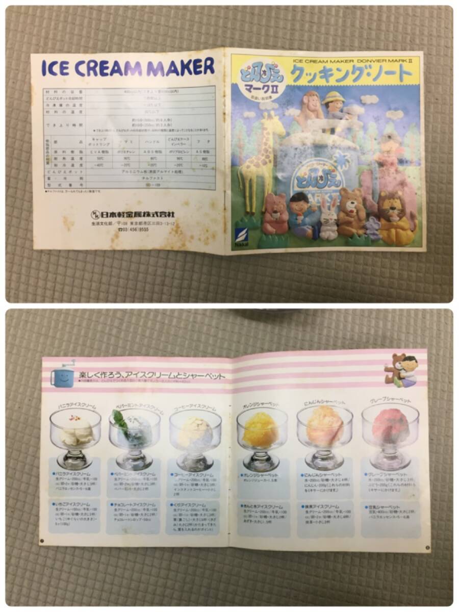 ◎サイズ 大きさは画像2をご参照ください。 重量:約 1445g ※箱込み:約1627g ※多少誤差は生じると思います。 -------------- ◎状態 擦れ・傷・汚れ・経年劣化:あり ・長期保管品のため簡単に清掃しました 画像1にあるものが全てです。 説明書などありません。 画像2のように組み立てて、ハンドルが 回るかどうか確認した程度の動作確認です。 ハンドルは回りました。 実際にアイスクリームを作るという 実践動作確認は行っておりません。 全体的に傷や汚れがあります。 静電気が発生しやすいのか ホコリやチリなどゴミの付着があります。 軽く清掃しましたが、まだ多少付着 しています。 箱やクッキングノートには 汚れ、破れ、折れ、など ダメージが多数あります。 -------------- 長期保管品のため、元々がかなり 汚れていました。清掃はしたものの、 取り切れていない汚れが残っていると 思います。ご利用になる前に今一度 洗ってからご利用ください。 使用不可というほどの状態ではあり ませんが、あくまでも中古、長期に 渡る保管品という事をご了承ください。