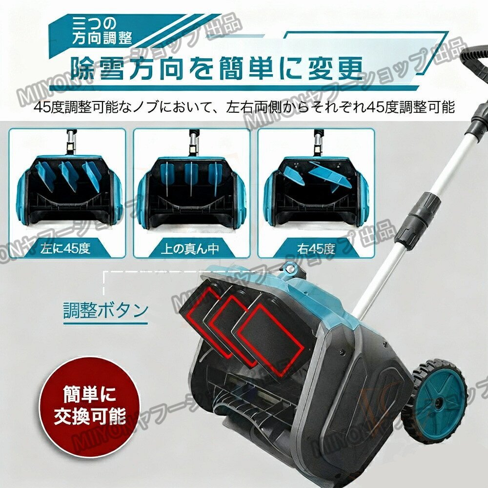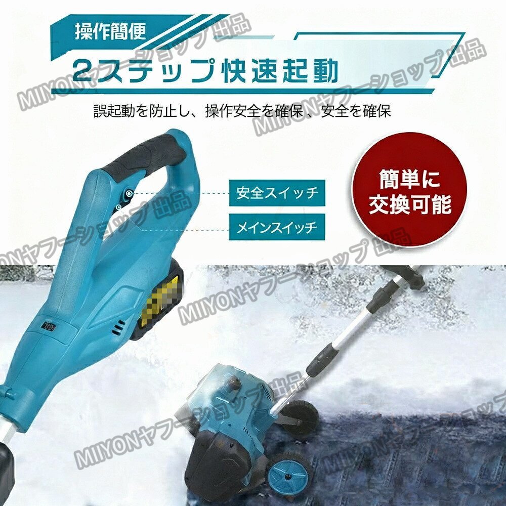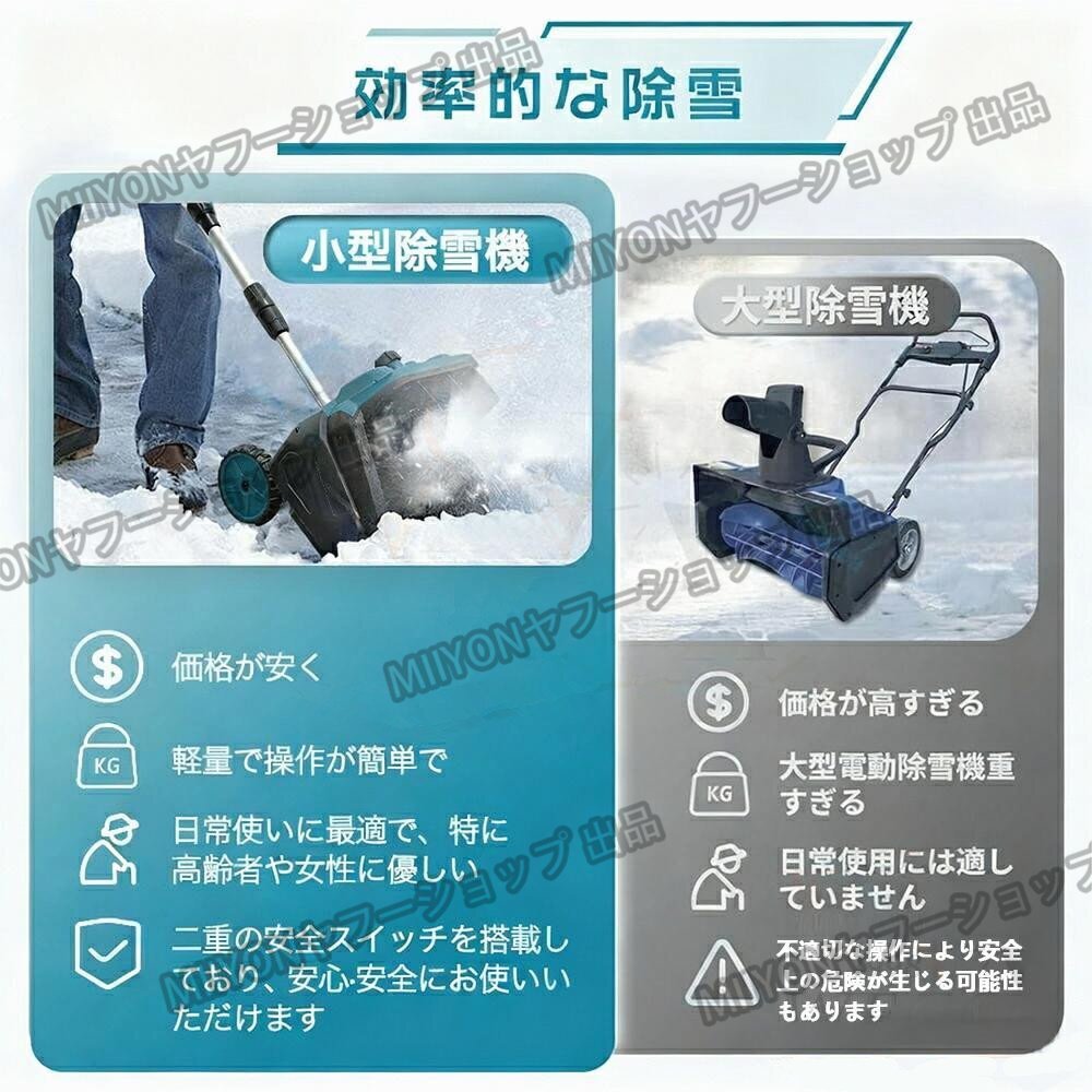 【安全性】 電動除雪機のデザインはユーザーの安全を考慮しています。安全なスイッチボタンのデザインは、正しい操作時にのみ起動し、意外な傷害を防ぎます。また、ガソリン除雪機と比較して、電動除雪機のリスクは低く、住宅地域や商業地域での使用がより安全で信頼性があります。