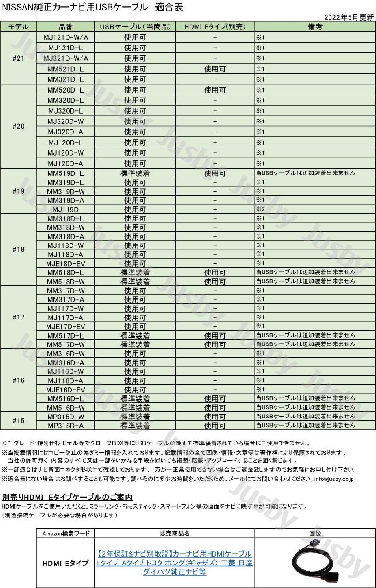 | 日産純正カーナビ専用 互換USBケーブルです。 日産純正ナビゲーション専用互換USB接続ケーブル(1.5m)です。 (MM521D-L MM321D-L MJ321D-W/A MJ121D-L MJ121D-W/A MM520D-L MM320D-L MM321D-L MJ320D MJ120D MM519D-L MM319D-L MJ119D MM318D-L MJ118D MJE18D MM317D MJ117D MJE17D MM316D MJ116D MJE16D等) 詳しくは適合表を御覧ください。 ※最新のiPhone/Android機種との接続は一部未適合な場合があります。ナビ取説等でお使いのスマートフォン等とのUSB接続の可否のご確認をお願い致します。 純正ナビと当USBケーブルを接続することにより、スマートフォンやUSBメモリー等を接続可能になります。 スマートフォンを接続することにより充電は勿論 スマートフォン内の音楽等をBluetoothより高音質で再生可能です。 またメモリースティックを接続することによりメモリースティック内の音楽や動画の再生も可能です。記憶媒体の容量次第ではメモリースティック1つで10万曲以上の音楽再生やDVD300本分の動画等も再生可能になります。 商品は2年間の品質保証付きです。またPL保険(製造物賠償責任保険)加入済みですので安心してお買い求め下さい。 【ご注意】 動画再生・音楽再生はナビの機種により仕様が異なります。ナビの取説等で、再生可能フォーマット等の仕様をご確認の上ご注文ください。ナビによりUSB接続後にナビ本体の設定が必要になる場合があります |