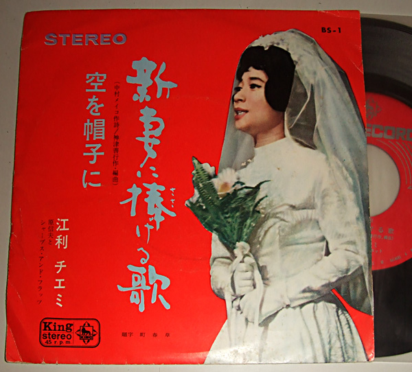 1964年にキナグレコードから発売されました、江利チエミのEPレコードです。(BS-1) 演奏は原信夫とシャーブス。アンド・フラッツです。 以下色文字曲をクリックするとmp3でご試聴できます。 (概ねこの盤の平均的ノイズレベルとご理解下さい) A 新妻に捧げる歌 B 空を帽子に |