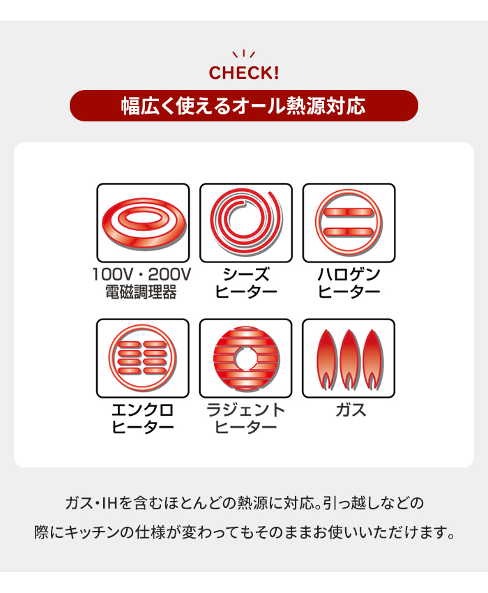| 200V|オール熱源対応 ◎全ての熱源に対応しています。 (※電子レンジ・オーブンレンジには使用できません) ・電磁調理器 ・ガスコンロ ・エンクロヒーター ・ラジェントヒーター ・ハロゲンヒーター ・シーズヒーター |