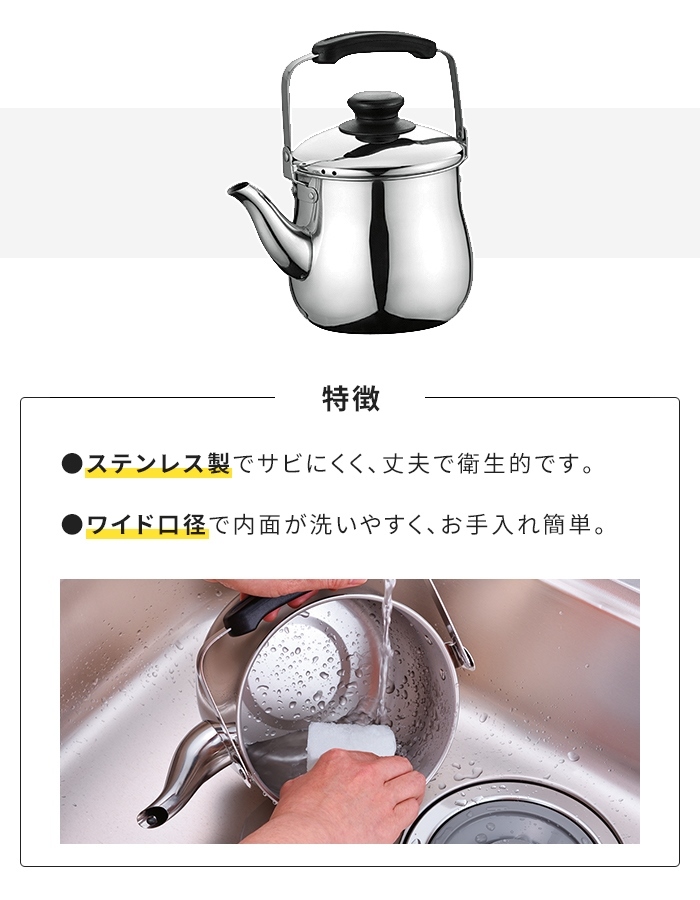| 広口ケトル 1.8L ステンレス製 IH ガス火 オール熱源対応 湯沸かし やかん 洗いやすい キッチン雑貨 シンプル 便利 ステンレスケトル やかん 薬缶 湯沸しヤカン 3.2リットル 広口タイプ ガス火対応 IH対応 お手入れ簡単 サビにくい キッチン用品 キッチン 台所 家庭用 業務用 |