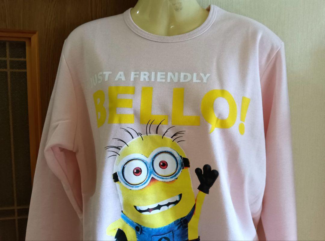 ミニオンの「JUST A FRIENDLY BELLO!」プリントが施されたLサイズの上下セットルームウェア。