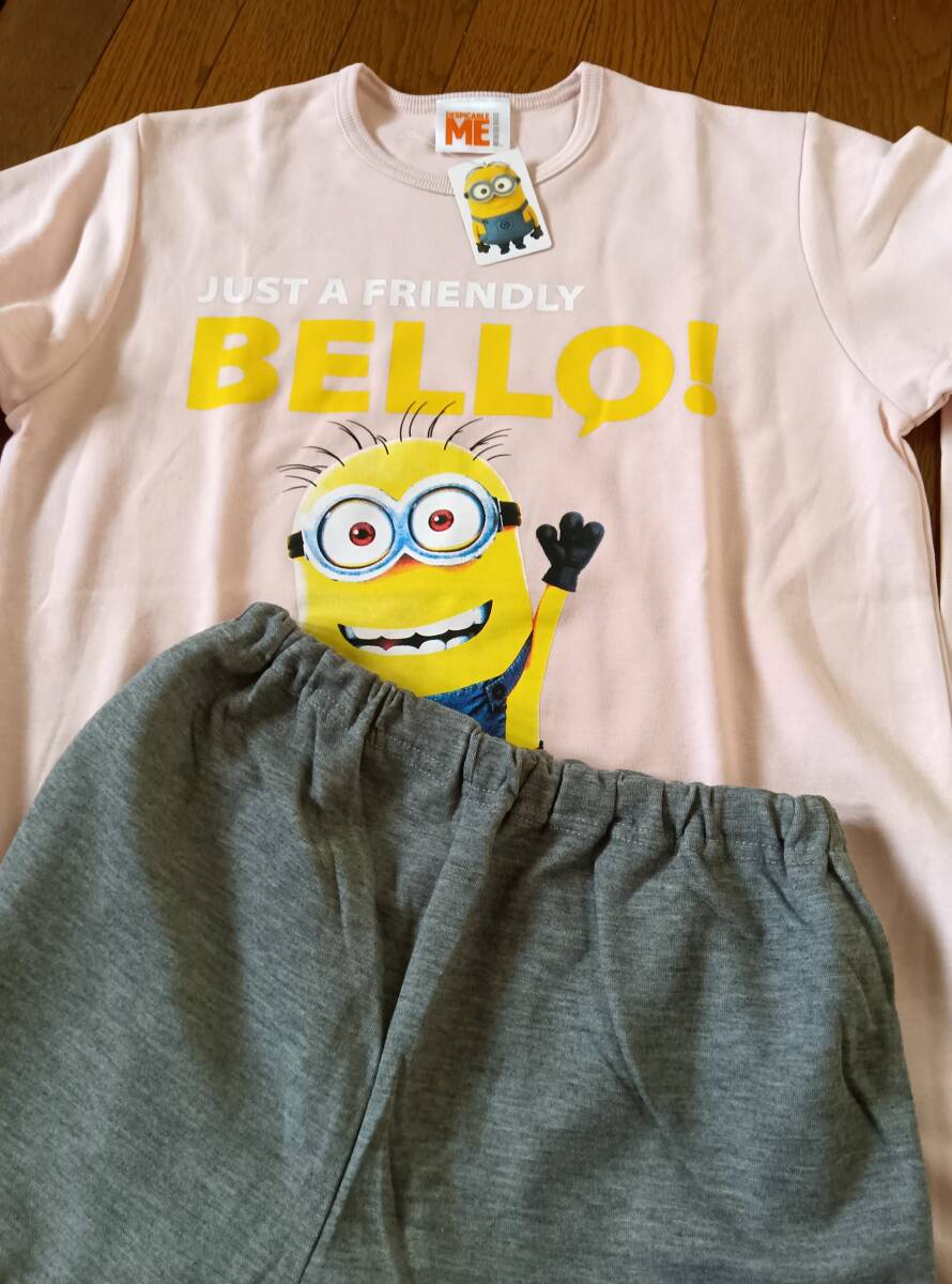 - キャラクター: ミニオン - サイズ: Lサイズ - セット内容: 上下セット - 状態: 新品 - デザイン: ピンクのTシャツとグレーのパンツ