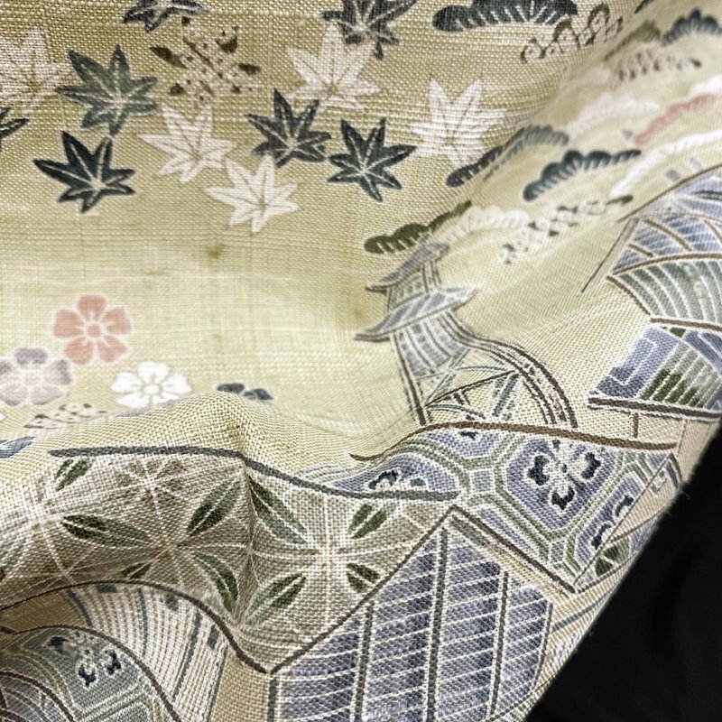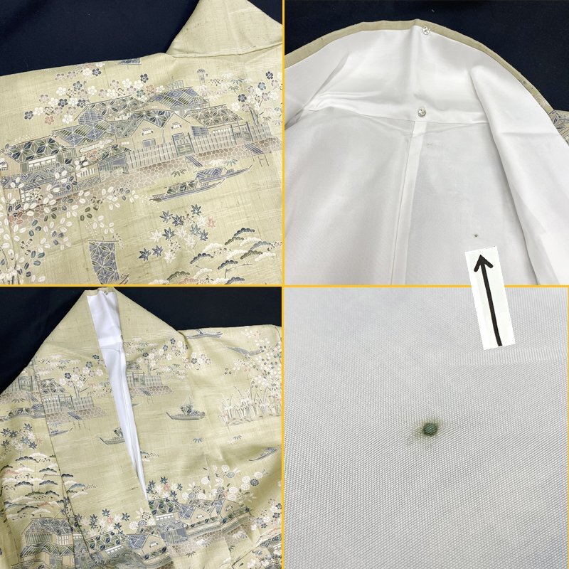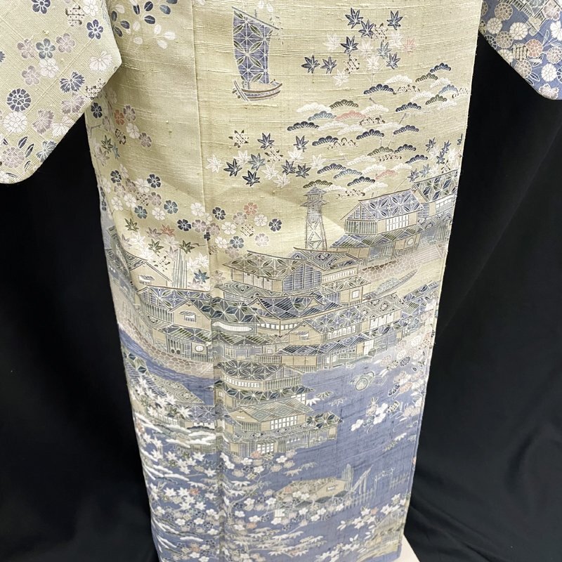| ●しょうざん 生紬 訪問着 苗色 茶屋辻文様 鳥瞰図 袷仕立て●美品 (No.eid) 絹らしからぬざっくりとした風合いが素敵な「しょうざん」生紬の訪問着です。柔らかな苗色(淡い黄緑色)の節のある地には、小船や屋形船が行きかう美しい港町に、楓、萩、松、唐花など細かな植物がございます。袖や裾には少し灰がかった青の暈しがあり、着物を開いても見事。シックなデザインと軽やかな着心地が魅力の生紬です。(画像の帯502mn64や小物は参考商品で、本品には含まれません)。 趣味性を極めたしょうざんの生紬は、おしゃれな着物愛好家に愛される味のあるお着物です。柔らか物とは一味違うお着物をお求めの方にオススメのおしゃれな着物です。 胴裏、スナップボタンによる錆汚れございますが、表地には影響ありません。その他には特筆すべきダメージなどない美品です。 【表地素材】正絹 【色】苗色 *モニターによって色味は実際と異なる場合がございます。 【サイズ】裄:63.1cm、丈(肩から):162.4cm、袖幅:32.4cm、袖丈:49.5cm、前幅:24.7cm、後幅:28.8cm、裄の縫込み 身頃側:3.5cm、お袖側:2.3cm、内揚げ幅:3.7cm *素人採寸のため、多少の誤差はご容赦ください。 上質な逸品ですので、いかがでしょうか?よいお品物でお勧めです^^ | |