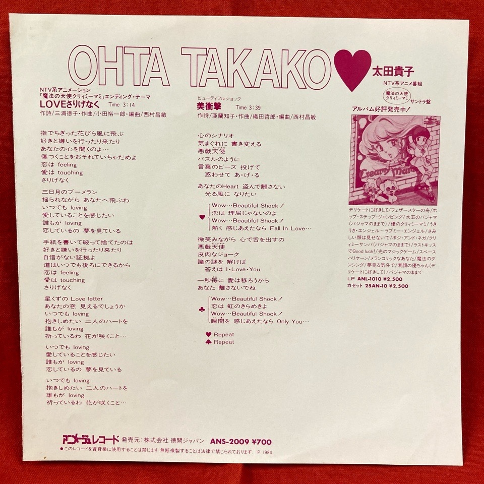 | 【アーティスト】 太田貴子 【タイトル】 LOVEさりげなく 【規格番号】 ANS2009 【商品説明】 7インチシングル/魔法の天使クリィミーマミ 【状態】 EX/EX+ |
