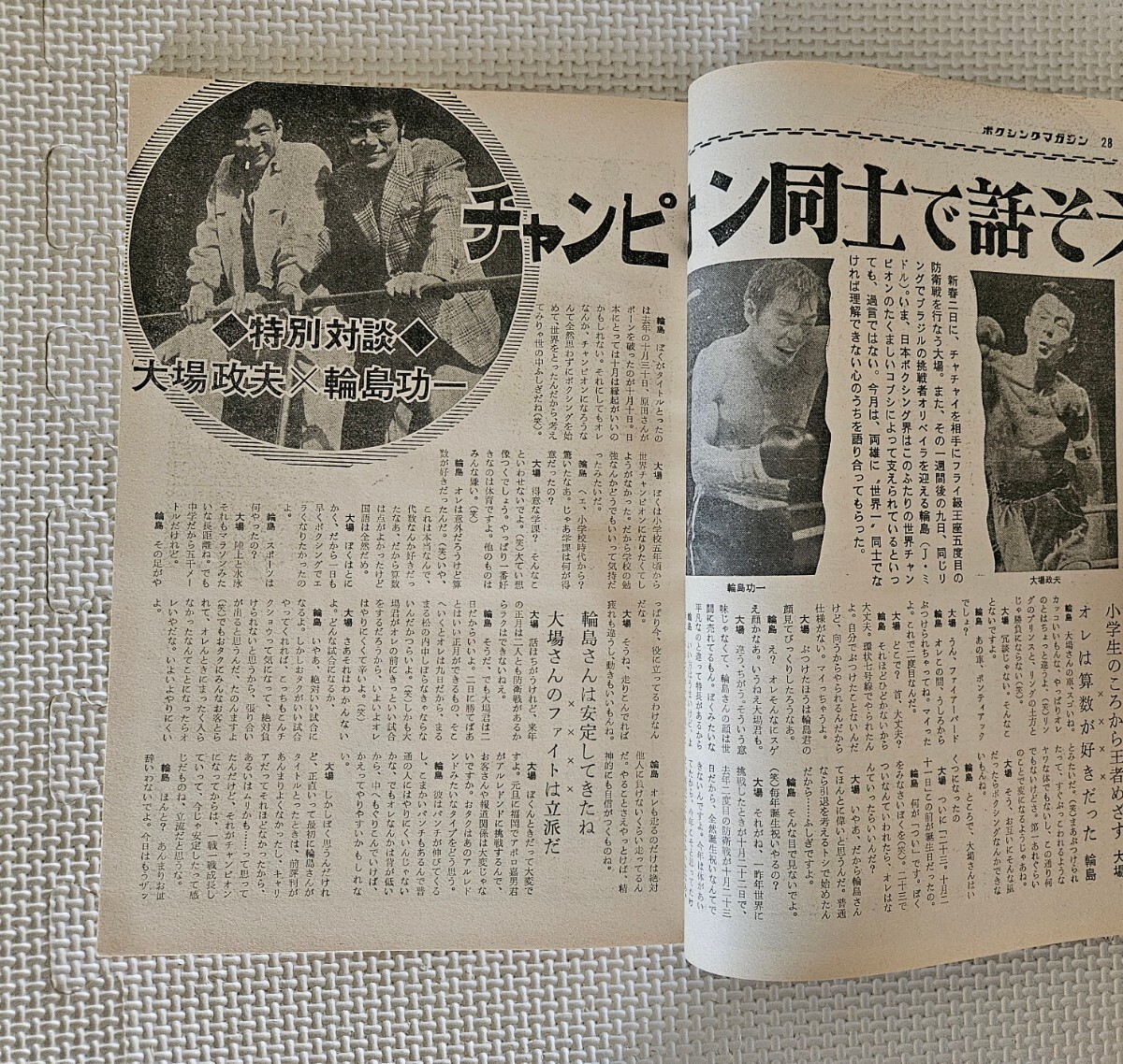 経年による傷みはありますが、切り抜きや書き込みはありません。とじ込み付録の「モハメド・アリ ピンナップ(2番目の画像ご参照)」もきれいです。年代を考慮するとコレクション用としてはまずまずの状態だと思います。伝説のチャンピオン大場政夫と輪島功一の対談(7~9番目の画像ご参照)はマニア必読です。他にも色々な商品を出品しておりますので、自己紹介欄と合わせてご覧いただけると幸いに存じます