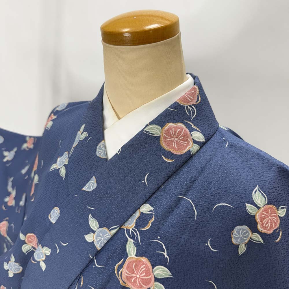 商品名 | 小紋 単衣 洗える着物 幅広 大きい 裄66.8cm 身丈159.5cm 花柄 お洒落着 普段着 ポリエステル 青 美品 M サイズ 4592 |