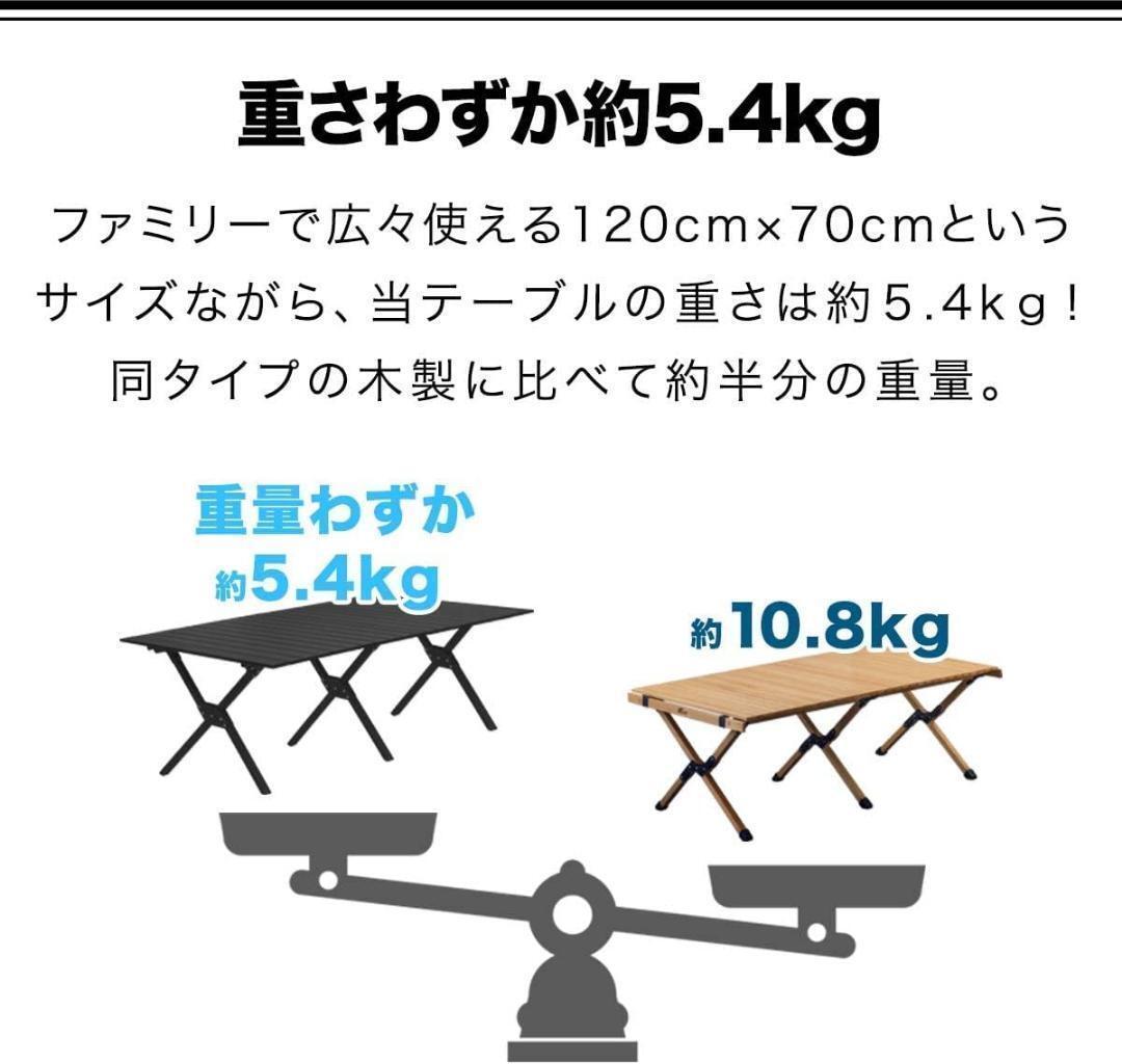 【重さわずか約5.4kg】 ファミリーで広々使える120cm×70cmというサイズながら、当テーブルの重さは約5.4kg。同タイプの木製に比べて約半分の重量。軽量の為、ラクに持ち運びできます。