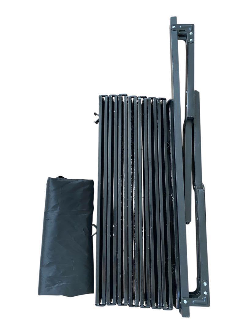 【軽量&サビに強いアルミ製テーブル】 シックなマットブラックの幅120cmのテーブル。材質は、軽くてサビに強いアルミを採用。ロール式天板、組立て式フレームで小さく収納可能。幅も120cmある為、ファミリーでも広々使えます。
