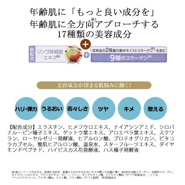 | 美しさをうみだす最高峰ジェル※1の新時代、ワンランク上の高密度ハリと高密度保湿で満ち足りた肌へ プレミアムリフト※2処方で湧き上がるようなハリのある弾力肌へ。4カ月腐らない奇跡のリンゴから抽出したリンゴ幹細胞エキス※3を新配合。ハリ不足、くすみ※4、乾燥、深まる年齢肌の悩みへ全方向※5アプローチ。 年齢とともに乱れがちな肌にうるおいを与えます。 (※1ハリを与える美容成分がコラリッチジェル内で最多配合 ※2保湿によるハリを与えること ※3保湿成分 ※4乾燥による ※5肌にハリ・つやを与え、肌荒れを防ぎ、乾燥小じわの目立たないキメの整った状態に導く) | |||
