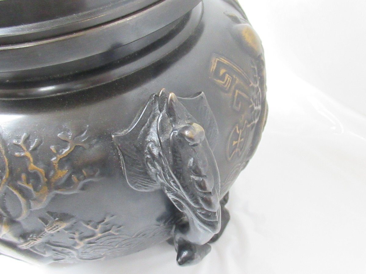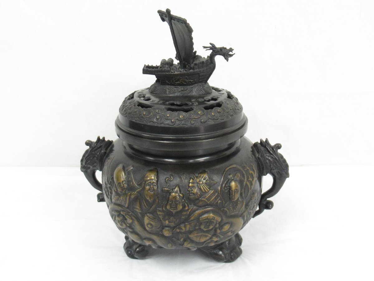 ■商品名:吉秀 銘入り 鋳銅 香炉 茶道具 七福神彫 宝船 高さ約16cm 口径約15cm 重量約432g