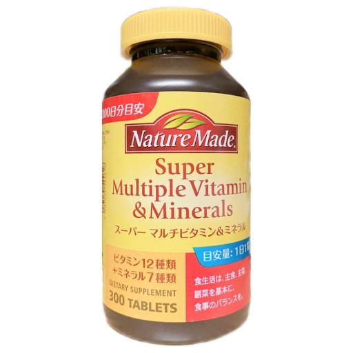 ネイチャーメイド スーパーマルチビタミン ミネラル 300粒(120粒の2.5倍) サプリメント 大塚製薬ビタミン12種類とミネラル7種類をギュッと1粒に凝縮しました。健康づくりの基本に、毎日摂りたいベースサプリメントです。栄養機能食品(亜鉛・銅・ビオチン) 亜鉛:味覚を正常に保つのに必要な栄養素です。皮膚や粘膜の健康維持を助ける栄養素です。タンパク質、核酸の代謝に関与して、健康の維持に役立つ栄養素です。 銅:赤血球の形成を助ける栄養素です。多くの体内酵素の正常な働きと骨の形成を助ける栄養素です。 ビオチン:皮膚や粘膜の健康維持を助ける栄養素です。 栄養成分表示:1粒当たり エネルギー:3.33kcal、タンパク質:0~0.1g、脂質:0~0.1g、炭水化物:0.671g、食塩相当量:0~0.01g、カルシウム:200mg、マグネシウム:100mg、亜鉛:6mg、鉄:4mg、銅:0.6mg、セレン:50μg、クロム:20μg、ビタミンA:1200μg、ビタミンB1:1.5mg、ビタミンB2:1.7mg、ビタミンB6:2mg、ビタミンB12:3μg、ナイアシン:15mg、パントテン酸:6mg、ビオチン:50μg、葉酸:240μg、ビタミンC:125mg、ビタミンD:10μg、ビタミンE:9mg ※ビタミンAのうち、900μgはβ-カロテン由来です。マルチミネラル| 出价者 | 信用 | 价格 | 时间 |