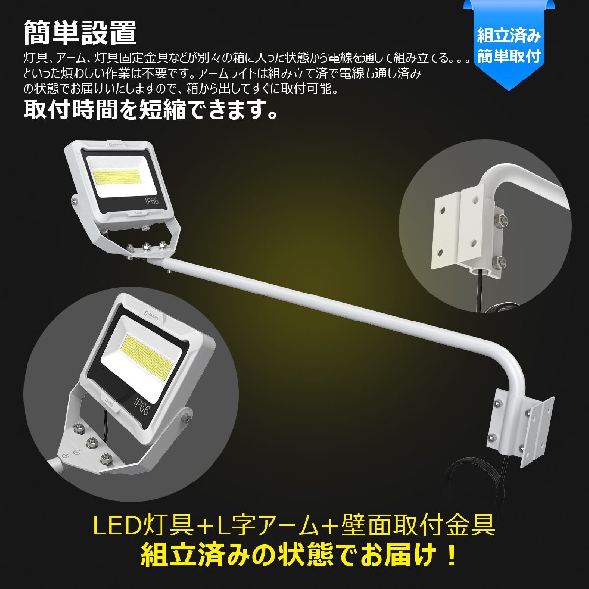 ★オススメポイント★ 高演色性Ra95を採用 太陽に近い色で自然で鮮やかに対象を照らします。 設置簡単:LED灯具+配線+L字アーム+壁面取り付け用金具を組み立てた状態でお届け! 面倒な組立作業は必要ありません。届いたその日に取り付け可能! 電源線収納可能 アームの中に投光器の電源線を通し、電源コードをスッキリ収納できます。 様々な設置方向適応可能 アームの取り付け部分360°調節可能なので様々な方向に設置できます。 静荷重試験による検証が実施済みです。 最大「風力階級12」相当の57m/s風速に耐えられますので、安心・安全に使用できます。 ※静荷重試験とは、一定荷重あるいは一定変形毎に加力を止め各部のひずみや変形の度合いを測定するものです。 様々なシチュエーションで使えます。 ・屋内外のサインボード、店舗の看板、広告看板、壁面看板、広告壁などの看板照明用。 ・展示会場・施設・建物の景観維持にもおススメです。 △ご注意△ 必ず垂直な壁面につりつけて使用してください。 特に灯具側が下がった状態で使用すると、灯具内に浸水してしまう可能性があります。 アームの施工は市販のワイヤーで補強してください。 |