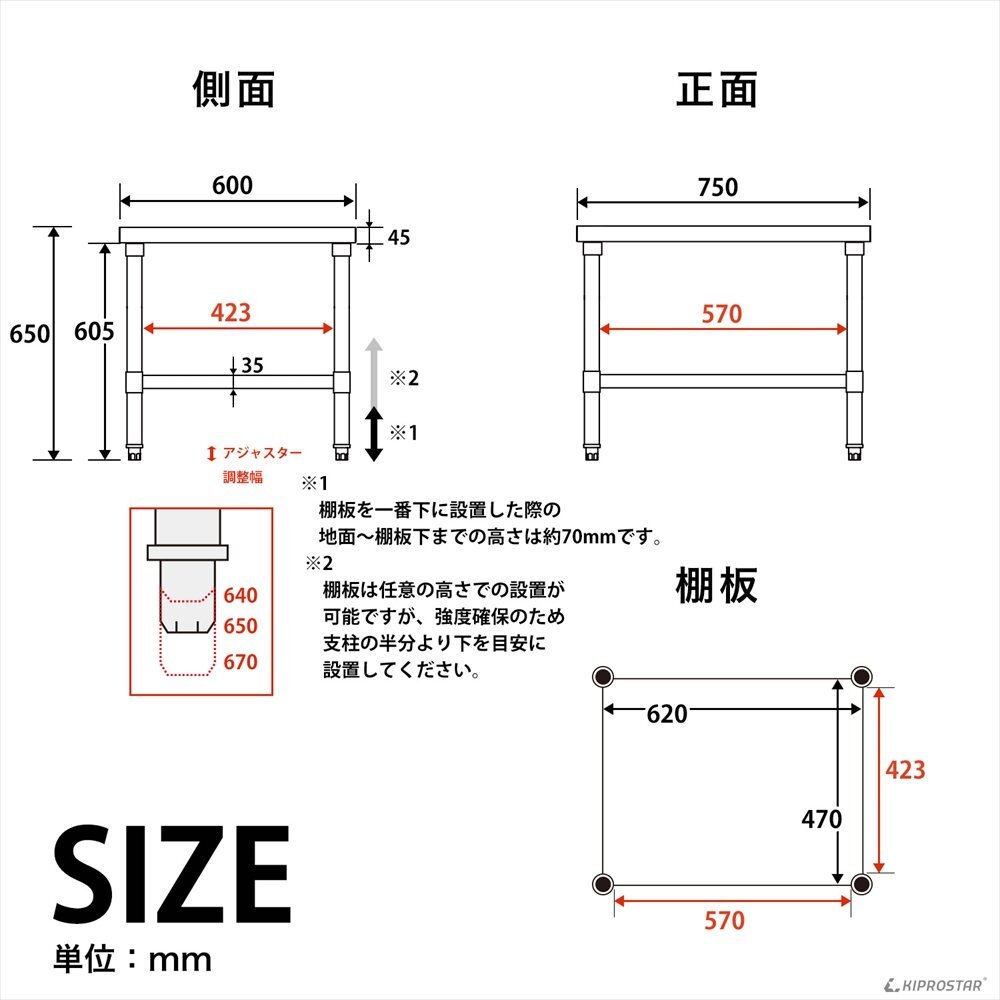| 材質 | 天板:ステンレスSUS430 脚:ステンレスSUS201 梁:スチール アジャスト脚:ステンレスSUS201/PVC |