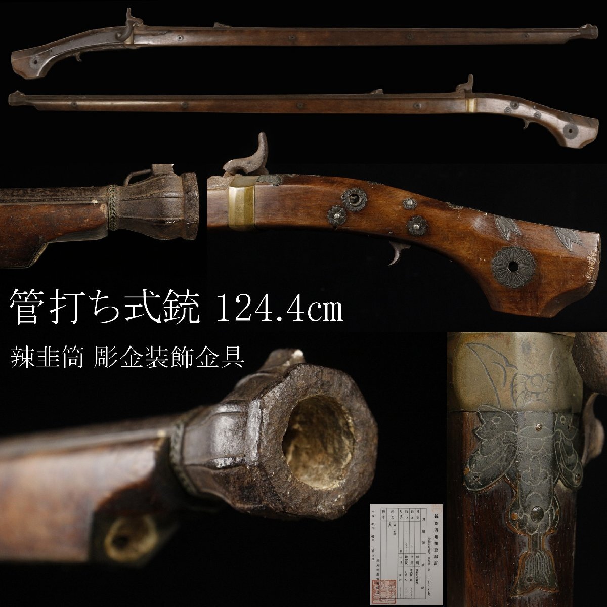 25110902 A* * * 商品詳細 * * * ここでしか出逢うことのできない唯一の美をご紹介させて頂きます。 繊細な彫金細工の施された金具が使用された華やかさのある管打ち式銃です。 経年を経た木肌が魅力的な銃床、重厚で錆付く姿も美しい銃身、 どちらもが合わさることにより一層迫力が感じられます。 古式銃ならではの緊張感が漂う、貫禄ある時代の逸品です。 この機会に是非お求めください。 ■商品内容/管打ち式銃、登録証。 ■サイズ/全長124.4㎝ 銃身96.9㎝ 重量1757g ■状態/経年による傷み、スレ、キズ、サビ、欠け、パーツ欠損がございます。 撃鉄が引っ掛からず、尾栓は外れません。 ※写真にてご確認、ご了承の上ご入札ください。 ご落札(購入)後は所定の期日までに都道府県の教育委員会に所有者変更の届出をお願い致します。 ![]() !かんたん決済 * * * 発送詳細 * * * 入金確認後3営業日以内に発送致します。 ※直接引き取りも可能です。 60~160サイズにつきましては 佐川急便、ゆうパックのどちらかで発送いたします。 ゆうパック発送の場合、弊社の発送日から追跡サービスに問合せ番号が反映されるまで 約1日ほどお時間がかかりますのでご了承下さい。 * * * 注意事項 * * * 運送中の破損があった場合は速やかに当社までご連絡下さい。 保険を利用するのに受取連絡後に運送会社による現場での破損状況確認が必要となります。 勝手に返送されますと保険の適用外となりますのでご注意ください。 * * * * * * お問い合わせ:082-236-8669 |