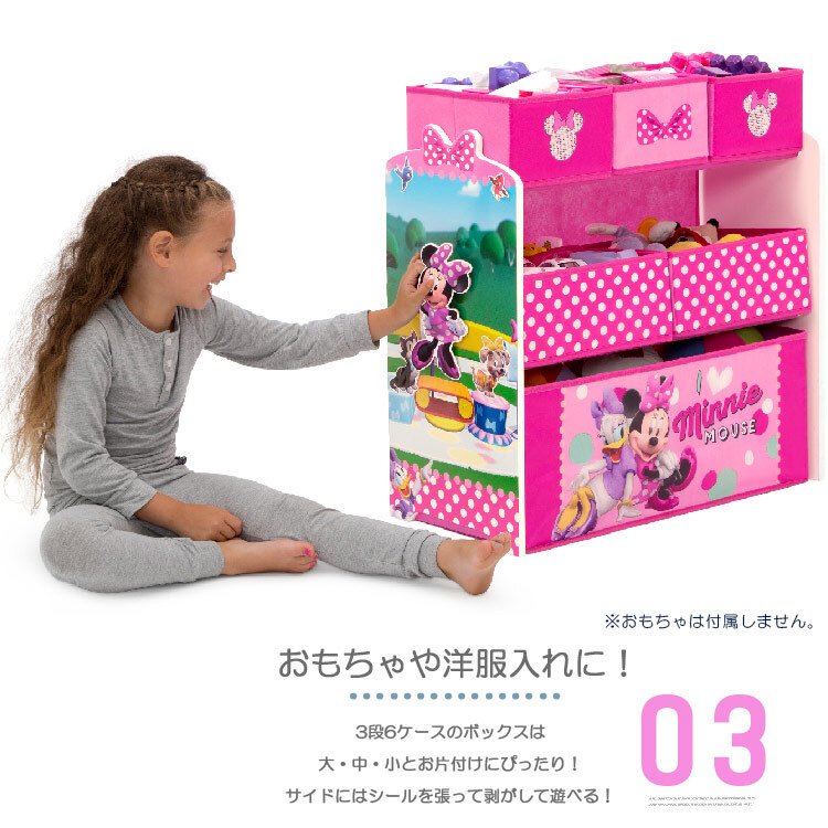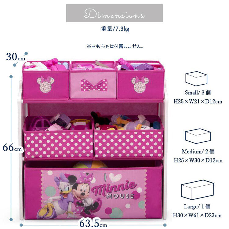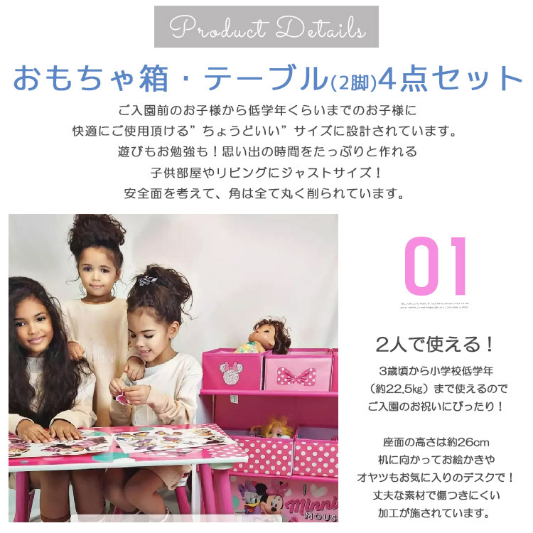 | 仕様 | ディズニー ミニーちゃんの、子供用おもちゃ箱とテーブルのセット! 大・中・小のマルチに使えるトイボックスはお子様自身でお片づけがしやすい軽量素材。 付属のシールを側面に貼って剥がして遊べます。 テーブルは2脚の可愛い椅子付きで、1人からお友達、姉妹で一緒に使う事が出来ます。 子ども部屋や、お子様のスペース作りにピッタリなセット! 安全面を考慮し角は全て丸く削られています。 |