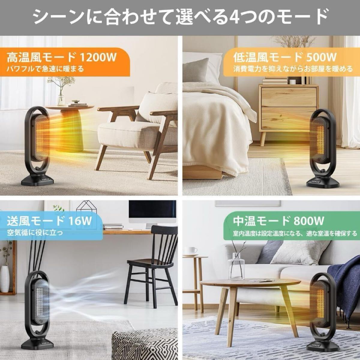 4段階温風(弱800w/中1000w/強1200/ECO)と1段階送風風量をドを搭載しています。