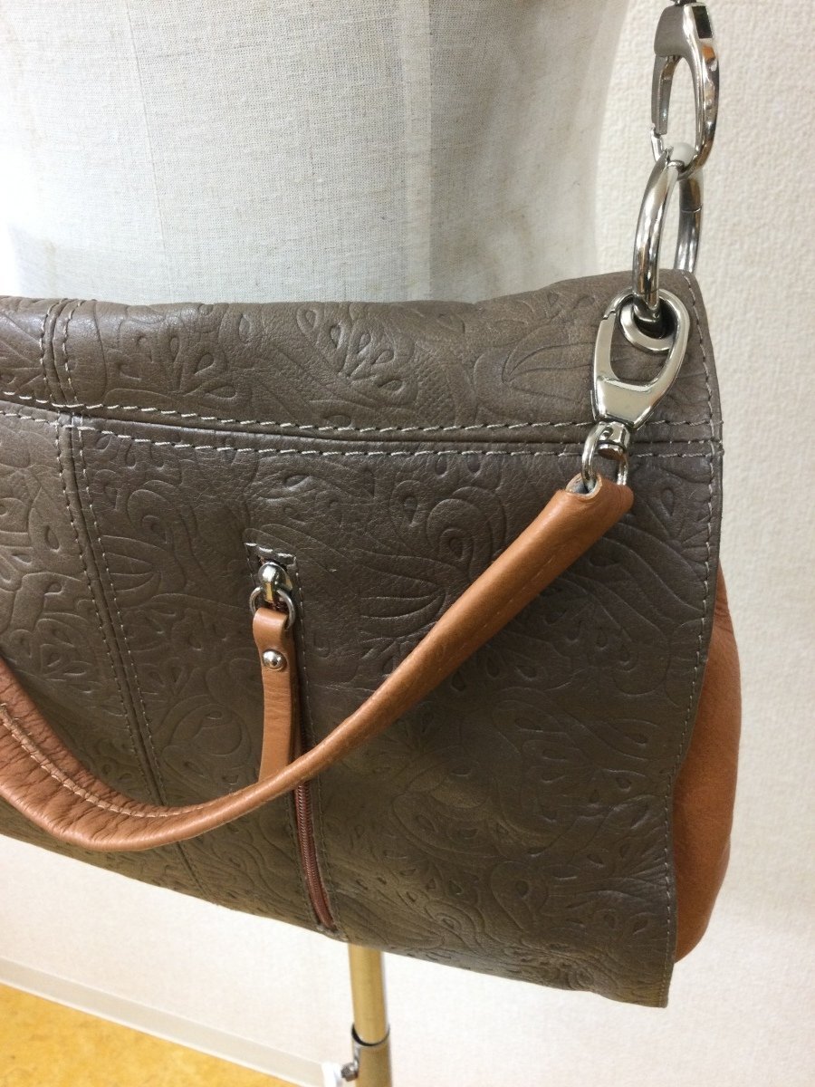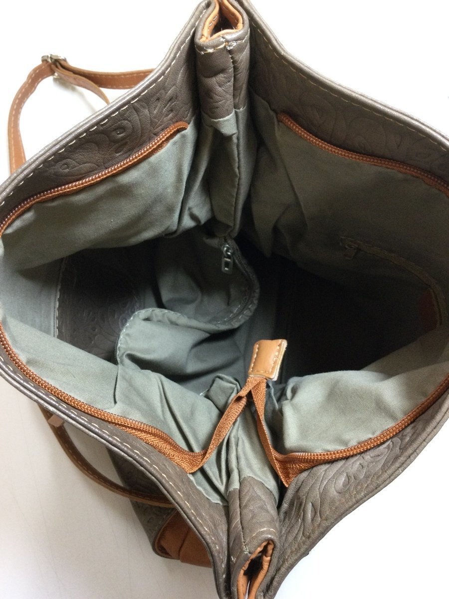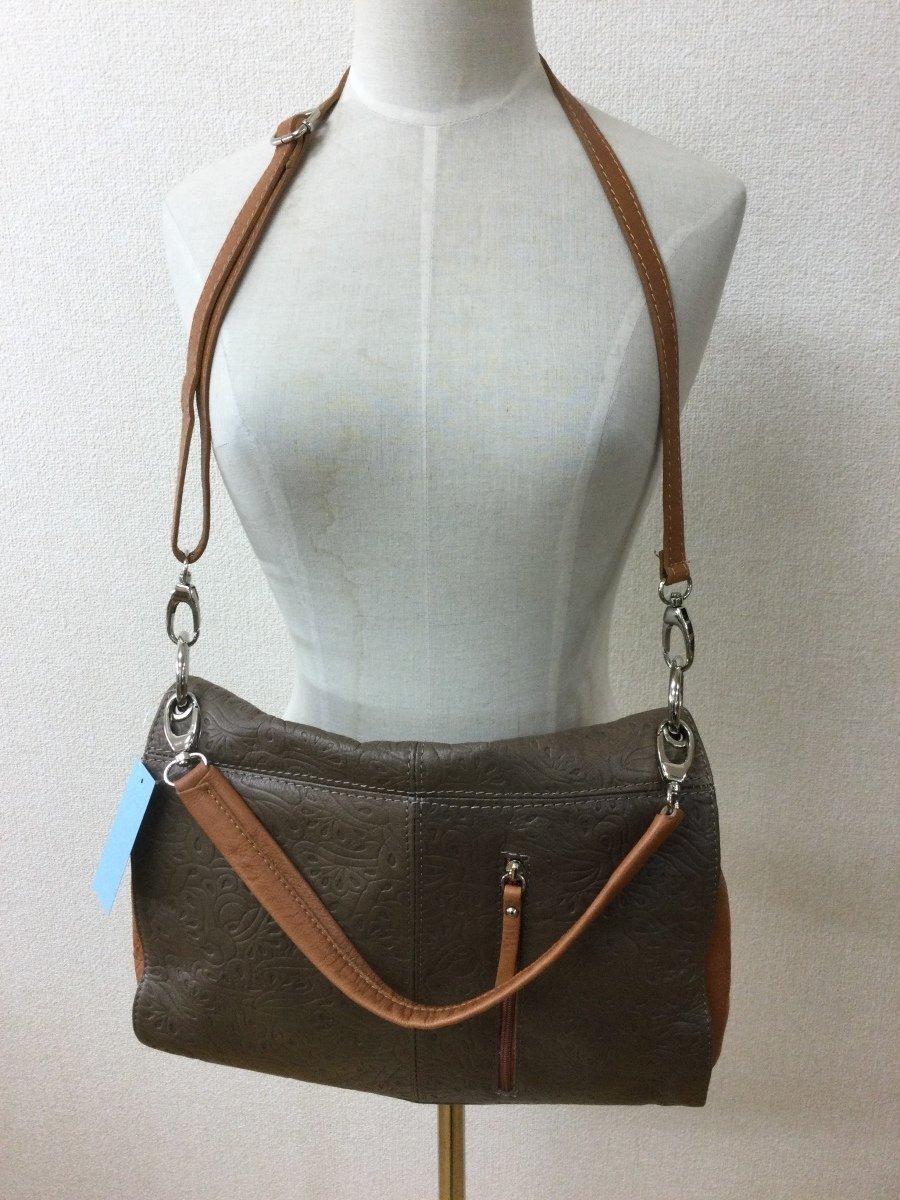 | 管理番号:135837 Creazioni in Pelle 本革 スモーキーな茶色 型押しのバッグ 表示サイズ:なし 高さ二段階で35cmおよび25cm、横幅34cm、マチ10cm 持ち手を替えてハンドバッグやショルダーバッグにできます 若干の角スレあり |