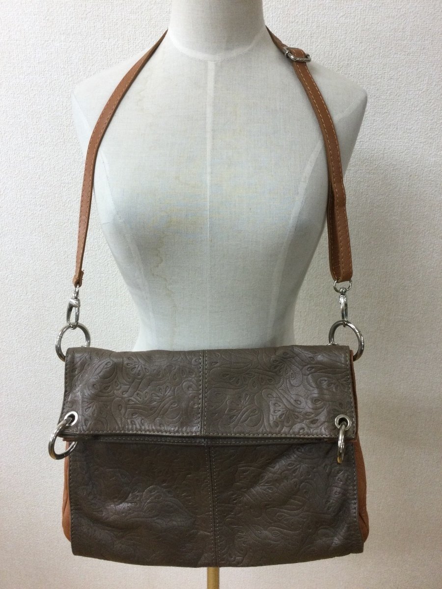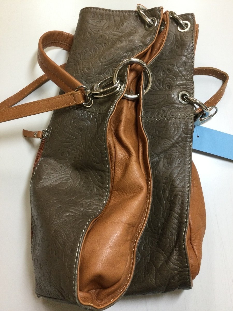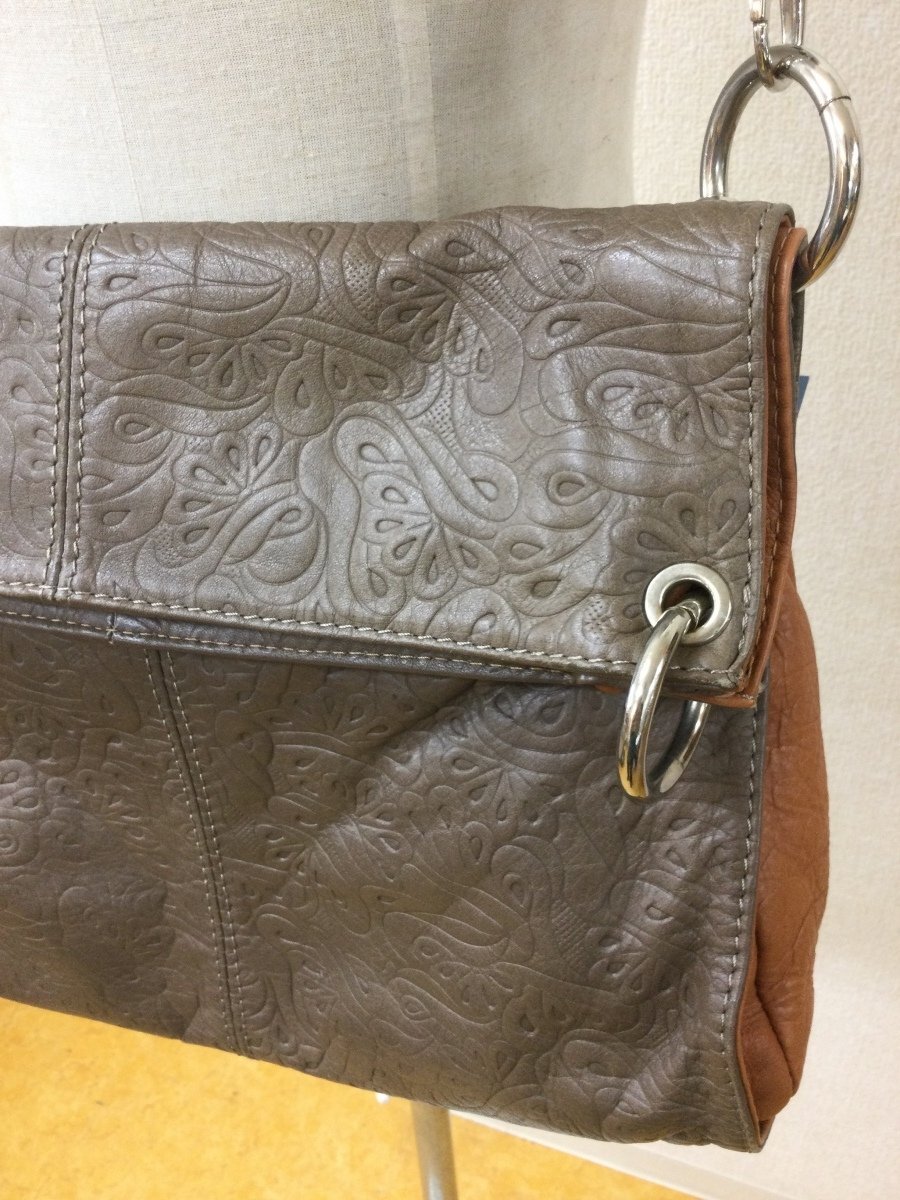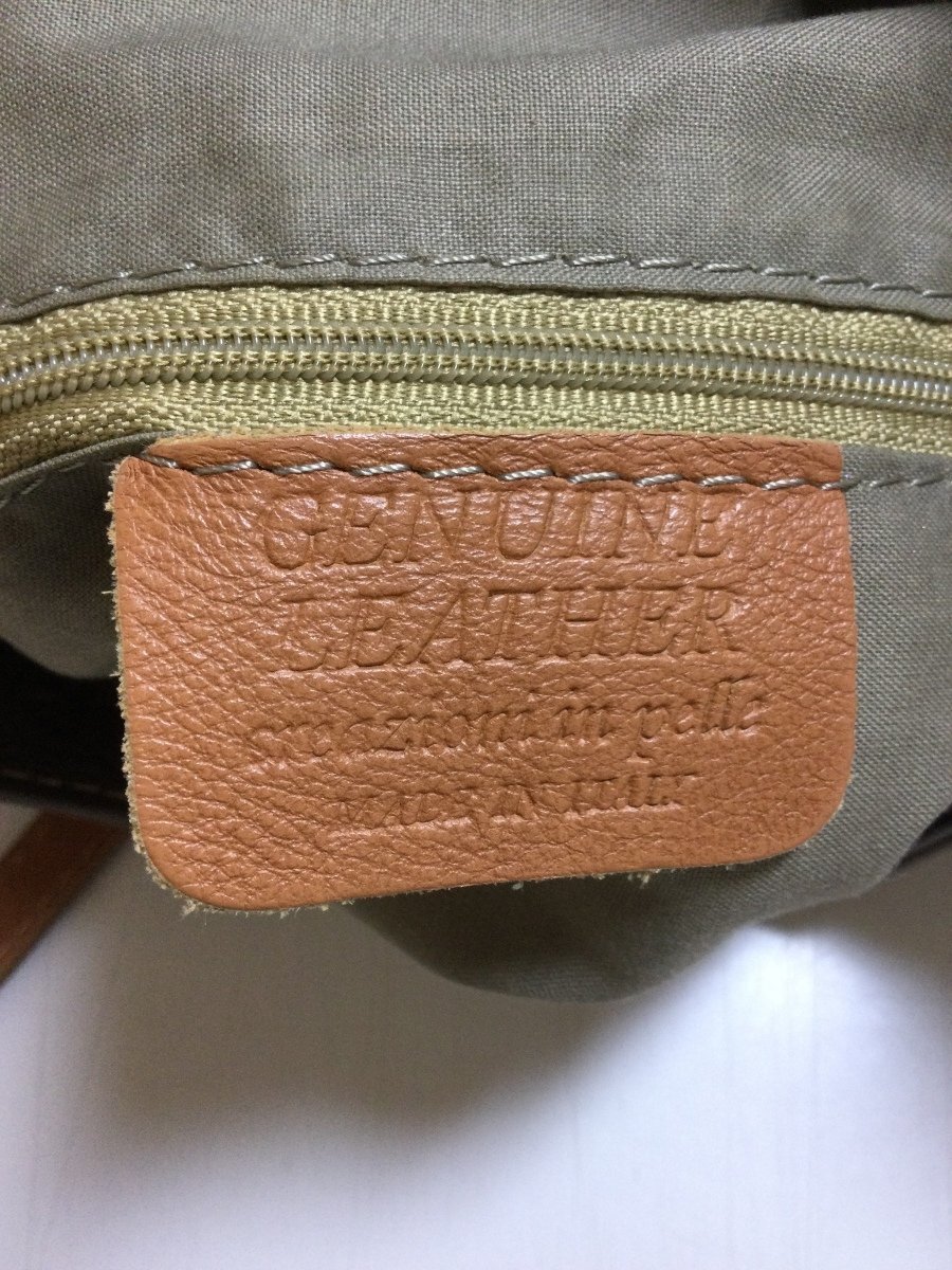 | 管理番号:135837 Creazioni in Pelle 本革 スモーキーな茶色 型押しのバッグ 表示サイズ:なし 高さ二段階で35cmおよび25cm、横幅34cm、マチ10cm 持ち手を替えてハンドバッグやショルダーバッグにできます 若干の角スレあり |