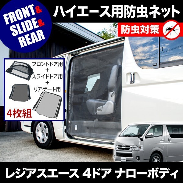 | 内容 | ナロー(標準)ボディ/標準ルーフ用 フロントドア用:2枚 (純正ドアバイザー対応) 片側スライドドア用:1枚 リアゲート用:1枚 ※フロント以外、左右同形状となります。 走行中にフロント用網戸は使用しないでください。 |