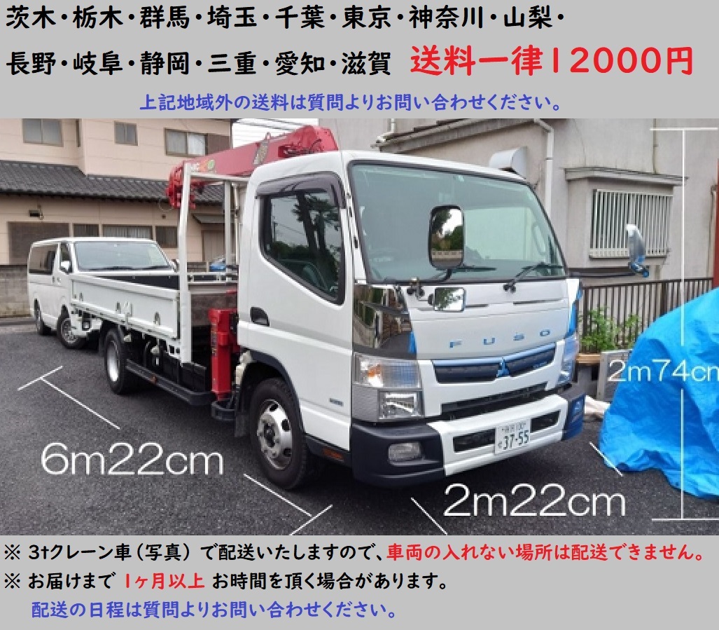 | 商品引き渡し | ① 茨木・栃木・群馬・埼玉・千葉・ 東京・神奈川・山梨・長野・岐阜・静岡・三重・愛知・滋賀 送料一律12000円 ↓ 配送条件があります。必ずお読みください。↓ ★日程・スケジュール★ ①日付・時間指定はできません。 配送日は月曜日~金曜日の平日に限ります。 ②お届けまで1ヶ月以上お時間を頂く場合があります。 合積配送を行っている為ご理解、ご協力をお願い致します。※配送の日程は質問よりお問い合わせください。 ★車両関係★ ① 3t車のクレーン付 で配送いたしますので、 車両の入れない場所は配送できません。 (全長6,220㎜×幅2220㎜×高さ2740㎜) ②クレーンで荷下ろしする為、急な坂道、電線、低い屋根の下など、ドライバーが危険と判断した場合は荷下ろしできません。 ※クレーンが使用できない場所への搬入は基本的にお断りさせて頂いております。 ③山岳地、降雪地域は天候や季節によって配送をお断りする場合があります。 ②上記地域外有料配送 送料は「出品者への質問」からお問い合わせください。 配送条件があります(上記、画像を参照ください) ③ 当社倉庫引取り 【お引取り場所】 〒350-2213 埼玉県鶴ヶ島市脚折1596-1 【引取可能時間】 (月)~(金) 9:00~16:00 ※土日祝 休 ※冬季・夏季休業、GW等の長期休業は倉庫引取も休業となります。 ※商品を手前に出しておくなど準備時間が必要です。 事前に日時をご相談の上ご来社ください。 ※軽トラック、乗用車の積込はお勧めしません。 ※構内が狭い為、4t以上の車両はお受けできません |