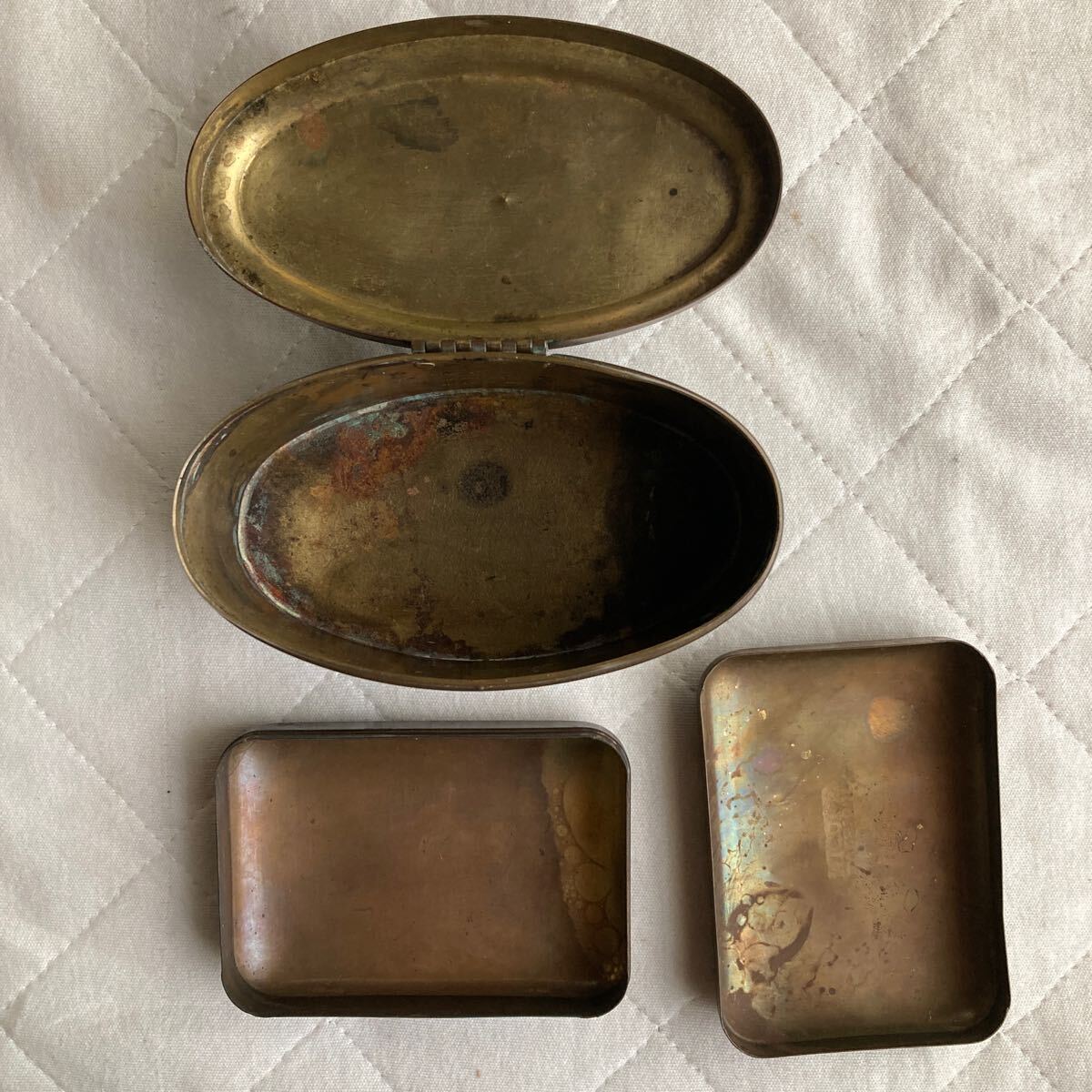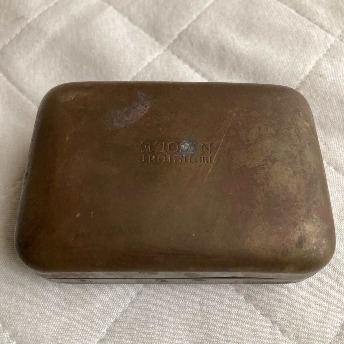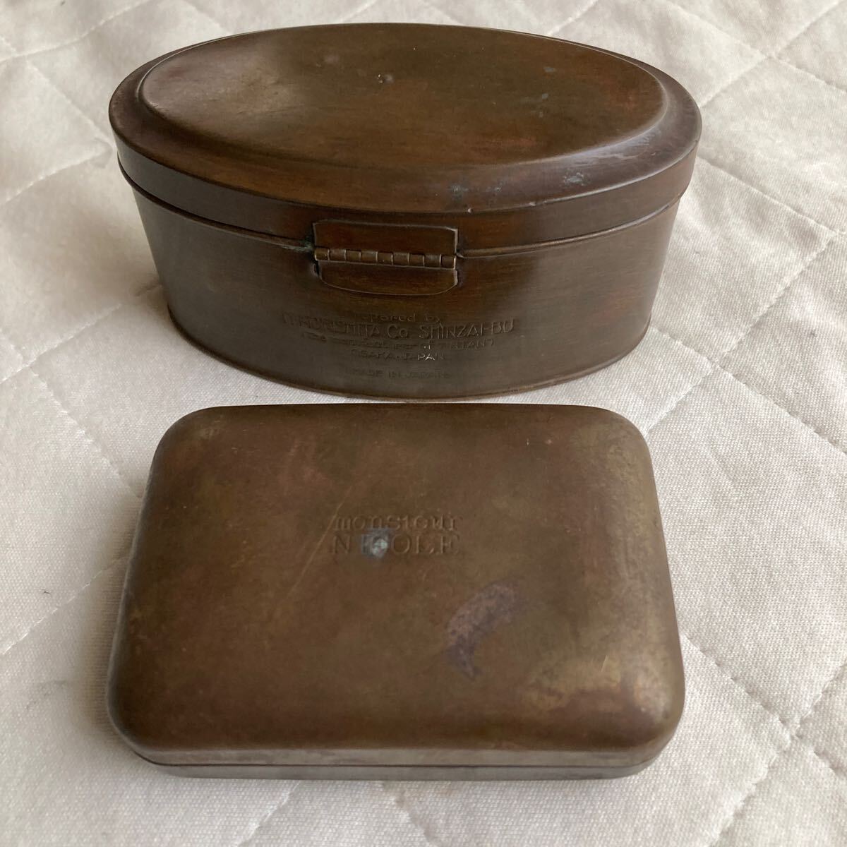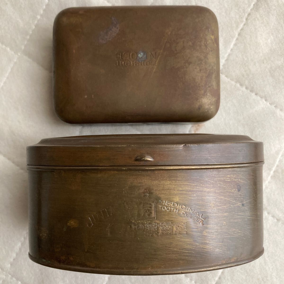 私の土佐.高知.田舎.近所.古い旧家屋敷.蔵に有った大正時代.昭和時代初期のレトロな歯磨き粉入れ11.MORISMITA .CO.SMINAI-BU.石鹸入れ..NICOLE.mOnSIeuL.材質は真鍮製.歯磨き粉入れ.石鹸入れ.二つ共に文字で象嵌が有ります。二つ共.JAPAN.日本製です。歯磨き粉入れの横幅.約10.6cm.奥行き.約6.3cm.縦.約5.3cmです.石鹸入れの横幅.約8.2cm.厚さ.約2.8cm奥行き.約5.8cmです。全て純正品.稼働品.完品.珍品です。ノンクレーム.ノンリターン.評価の低い入札者は此方でお断りする事が有ります。宜しくお願い申し上げます。| 出价者 | 信用 | 价格 | 时间 |