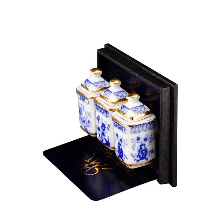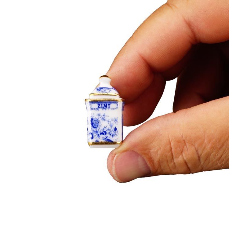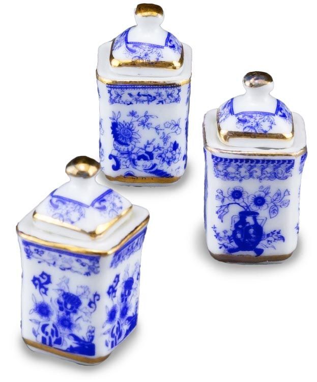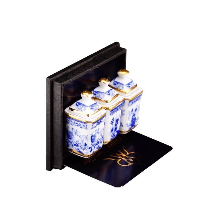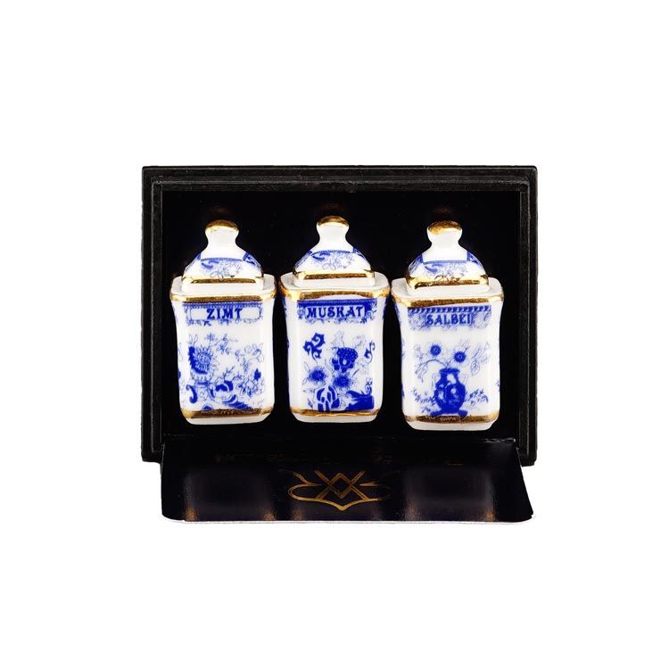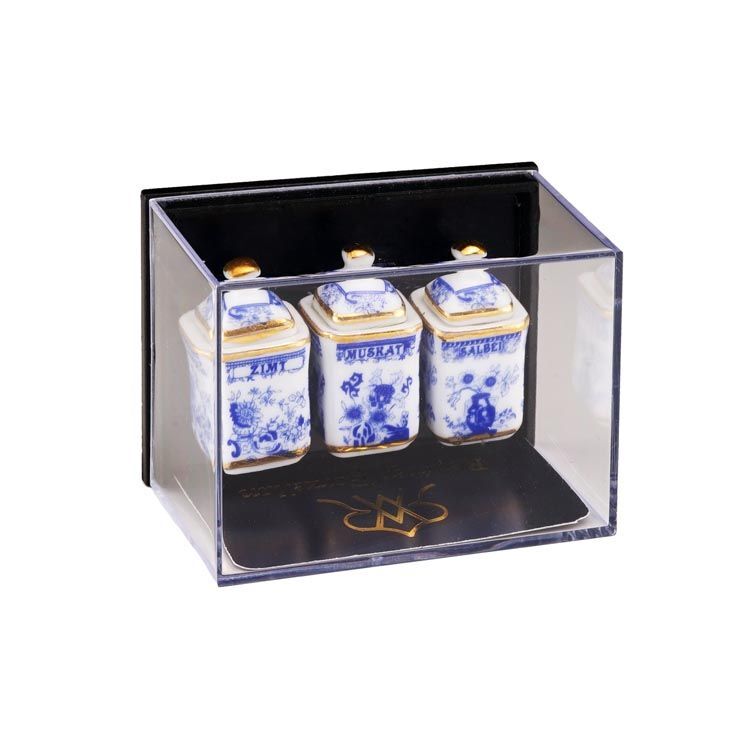 ドイツ ロイター社のミニチュアです。これはきれいで可愛い!キッチン用の少し大き目なキャニスター3個セットです。シナモン、ムスカート、セージとドイツ語で書いてあります。ぜひあなたのドールハウスのキッチンに!アクリルケース入りです。キャニスターのサイズ:14x14ミリ、高さ28ミリ。※フタは接着されています。アクリルケースからは取り出せます。